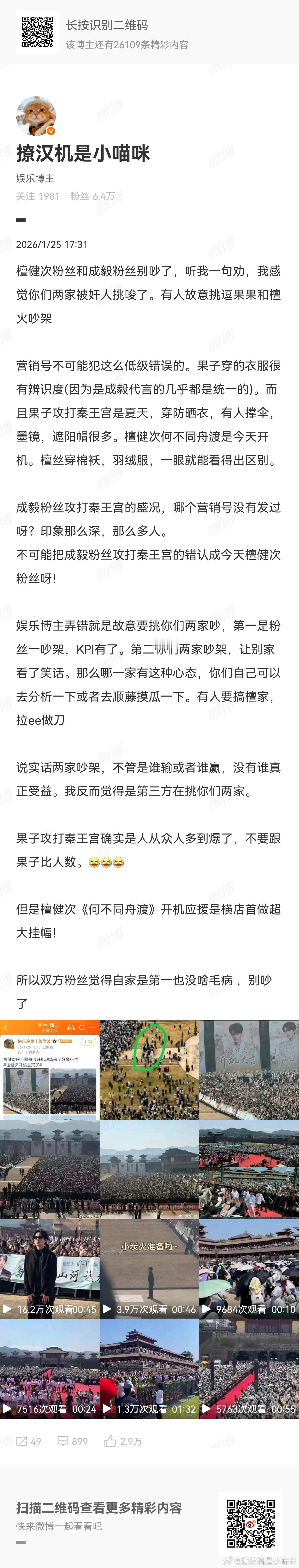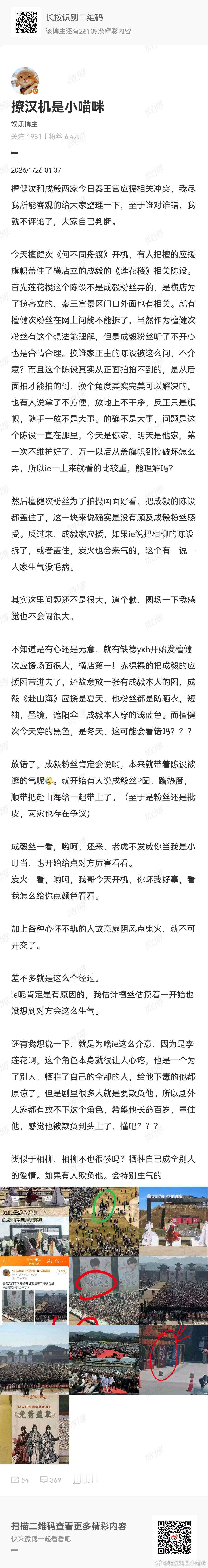 檀健次粉丝真的好会倒打一耙。说到底你们不破坏公共设施,哪来的战???管好自己的脚比啥都强,不要惹事了,再找理由甩锅别人爬到人家莲花楼的布景上去干嘛!!!我一开始还以为是爬站台上去,我还帮着圆场,结果是踩人家圣地巡礼四个字上,亏我还给你们找借口说是不是被挑事了。人成毅粉丝说我歪屁股拉架,我都一直不吱声,因为确实爬人家布景就是不对!峨眉山的猴啊???我都没有素质三连问,我真的是够偏你们了。说到底就是破坏公共设施,还舔个大脸吵架,但凡有点素质,看到别人这么做都得劝。这地方三天两头搞应援,怎么别家不爬呢?就你们特擅长爬是吧???花果山来的啊?现场这么多人,就没有一个人觉得攀爬公共设施不好??没有一个人懂尊重别人就是尊重自己?这么多个凑不出一个有素质的劝一下??说我引战,特么是我爬上去的?我去踩的?????去公园爬人家公园布景,别的游客不说你???不要胡乱攀爬公共设施,是不是做人基本常识我就问!我给你们找补这么多,还怪我,那我实话实说,就是没素质。我好心好意劝,还说我引战。睁开眼睛看看外面的世界,除了我这个营销号一直两头劝,其他营销号嘲疯了好么不要仗着我客气,就冲我大呼小叫的。享受九年制义务教育,就要做文明游客。有理不在声高 !