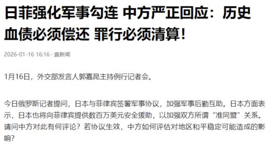 在北京的外交部例行记者会上,向来以克制著称的中国官方表态,突然“换了语气”。郭嘉昆发言人罕见地抛出六个字,“血债必须偿还”;紧接着,又一句“罪行必须清算”掷地有声。把中日关系的紧张推向了一个新节点。现场气氛一度凝重,外媒记者纷纷低头记录,显然,这场“突变”不容忽视。   麻烦看官老爷们右上角点击一下“关注”,既方便您进行讨论和分享,又能给您带来不一样的参与感,感谢您的支持! 有人可能会觉得,这么强硬的表态是不是针对当下某些局势?答案是肯定的。除了历史问题,当前日本在军事和地区战略上的动作,让中方不得不把历史和现实结合起来看待。 东亚局势复杂,日本在台海、东海等问题上的姿态频频试探,给地区稳定带来了潜在风险。中方这次发声,不光是追讨历史债,更是在提醒日本:你不能光看今天的利益,忘了历史责任,也不能一边喊和平,一边搞挑衅行为。 这波操作有意思的是,方式很中国。不是像某些国家动不动就上火箭、开战机,而是用外交、经济、战略多维手段去“压”。 外交上,你讲历史账,你亮底线;经济上,关键时候有手段让对方掂量掂量;安全上,更不用说,亚太地区的军事布置和战略监控中,每一次动作都被仔细计算。中方的意思很清楚,你挑事,但成本很高,历史账不算清,今天的挑衅也别想轻松过去。 这次发言的另一层含义在于战略信号。很多人只看表面,觉得只是对日本历史问题发声,实际上,中方在释放一个信息给全世界,尤其是亚太邻国:历史不能忘记,安全不能妥协,稳定不能被轻视。 中国不仅是用言语在讲道理,更是在用行动告诉大家,我们有能力守住底线,也有能力让历史和现实的账目平衡起来。 其实,外交部发言人的话,虽然简短,但分量十足。你看“血债必须偿还”,就是在提醒日本侵略历史的严重性,也是在告诉国内外,这个问题中国绝不含糊; “罪行必须清算”,则更进一步,把今天的行为和历史联系起来,强调不只是过去,还有现实和未来,都在中方的关注范围内。这样的表态,对于一些试图低估中国立场的外界力量,无疑是一次明确而又直观的警告。 为什么会在记者会上突然“换语气”?仔细想想,这是多重因素叠加的结果。日本近年的军事扩张、与某些大国的同盟动作,以及在历史问题上依旧轻描淡写的态度,让中国觉得,有必要公开、明确地表态,把历史账和现实风险一并讲清楚。 有趣的是,这种表态一出来,整个场景和气氛都不同了。以往,例行记者会更像是温和的日常说明,外媒记者记录、拍照、提问,大家点到为止。 但这次不一样,郭嘉昆一句话就让全场静默,连外媒都不敢随意评论。可以说,这种氛围,本身就传递了信息:事情严肃,而且后续还会有动作。 从长远看,这种强硬的外交表态有两层意义。第一,是对历史正义的坚守,让国内外清楚看到中国在历史问题上的底线;第二,是对地区局势的一种战略警示。 日本以及其他潜在挑衅者,都必须意识到,中方不会因为时间流逝而忘记,也不会因为表面和平就掉以轻心。历史和现实,在这里紧密相连,任何轻视都可能带来后果。 中国的这类表态,也体现了一种智慧,不是一味冲动,也不是简单示威,而是通过语言和态度建立压力,同时留有操作空间。 换句话说,中方用六个字就能让人心里发毛,用一句话就能把复杂的战略局势压缩成简单明了的信号,让对方明白:中国不会忘记过去,也不会放松现在。 总之,这次例行记者会上的强硬表态,是一次历史账与现实账的结合体,是一次外交手段与战略智慧的体现。中方明确表达了追求历史正义的决心,也释放了对现实挑衅零容忍的信号。 短短几句话,却把中日关系推向了新节点,把亚太局势的微妙变化清楚地摆在了全世界面前。历史和现实,这两笔账,都必须结清。 信息来源:日菲强化军事勾连 中方严正回应:历史血债必须偿还 罪行必须清算——直新闻2026-1-16