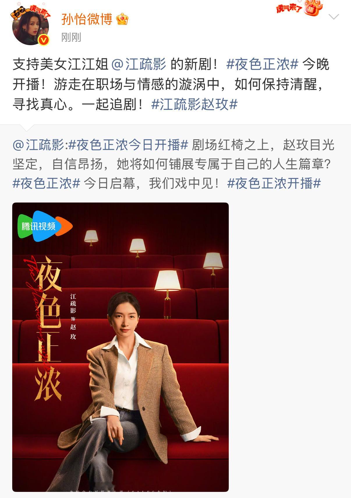 孙怡支持江疏影新剧孙怡为江疏影新剧打call啦,我们神灯家族的超长售后有,今晚江江的新剧《夜色正浓》追起来噜孙怡为江疏影新剧打call