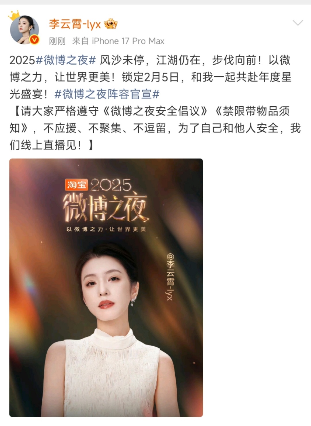 李云霄官宣微博之夜李云霄官宣出席微博之夜!临近年底李云霄忙完这个忙那个,前两天刚官宣加盟山东卫视春晚,昨天又参与百花迎春录制,还在春节档电影《镖人》中饰演燕子娘,还有待播剧《龙骨焚箱》。每一次出现都是不一样的惊喜,期待微博之夜的表现!