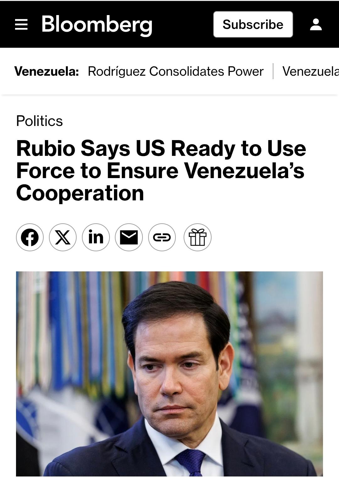 鲁比奥:美准备动用武力确保委内瑞拉合作 美国国务卿鲁比奥今天(北京时间1月28