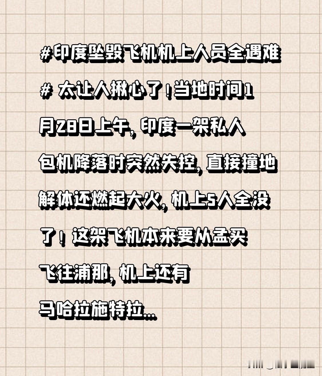 太让人揪心了!当地时间1月28日上午,印度一架私人包机降落时突然失控,直接撞地解体还燃起大火,机上5人全没了! 这架飞机本来要从孟买飞往浦那,机上还有马哈拉施特拉邦的副首席部长。现在民航总局已经责令调查,但事故原因还没查明。 每次看到这种空难新闻都忍不住揪心,愿逝者安息。大家觉得这次事故可能是什么原因导致的?评论区聊聊你的看法~