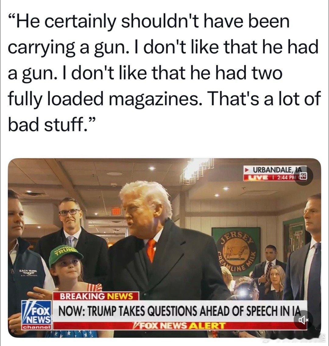 美国总统评“明州公民被杀”事件:他绝对不该带枪,我不喜欢他有枪、还有好多子弹,太糟糕了美国枪支协会:我们坚信,所有守法公民,都有权在任何地方合法携带枪支