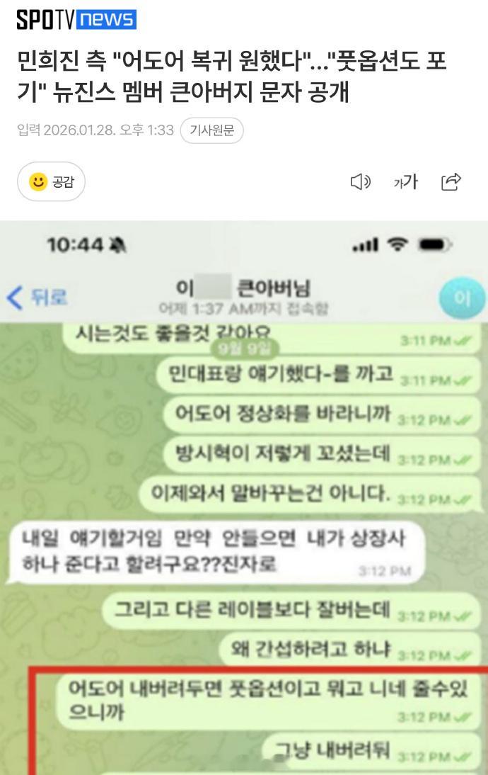 闵熙珍公开和李惠仁大伯聊天记录 闵熙珍前代表的诉讼代理人金善雄在紧急记者招待会上表示:“从闵熙珍前代表的角度来看,并不是‘一定要离开 ADOR’或‘一定要带走 NewJeans’,而是希望在 ADOR 履行职责的同时,守护其作为独立厂牌的角色。”作为该主张的证据,现场公开了闵熙珍前代表与 NewJeans 某成员(李惠仁)大伯A某之间的 聊天记录。金律师主张:“成员的大伯向闵前代表发送了他与 HYBE 申永宰的对话短信。大伯说让他负责去跟 HYBE 谈判,闵前代表相信了他。闵前代表认为拥有一个可以对话和沟通的窗口很重要,所以才跟成员的大伯谈了这些内容。”他接着表示:“闵前代表让他向申永宰转达‘达成 ADOR 正常化合议’的意见。她完全没有想过要把NewJeans 带走,而是说无论如何都要回归并带领NewJeans,无论如何都要让她们能正常开展活动。”
