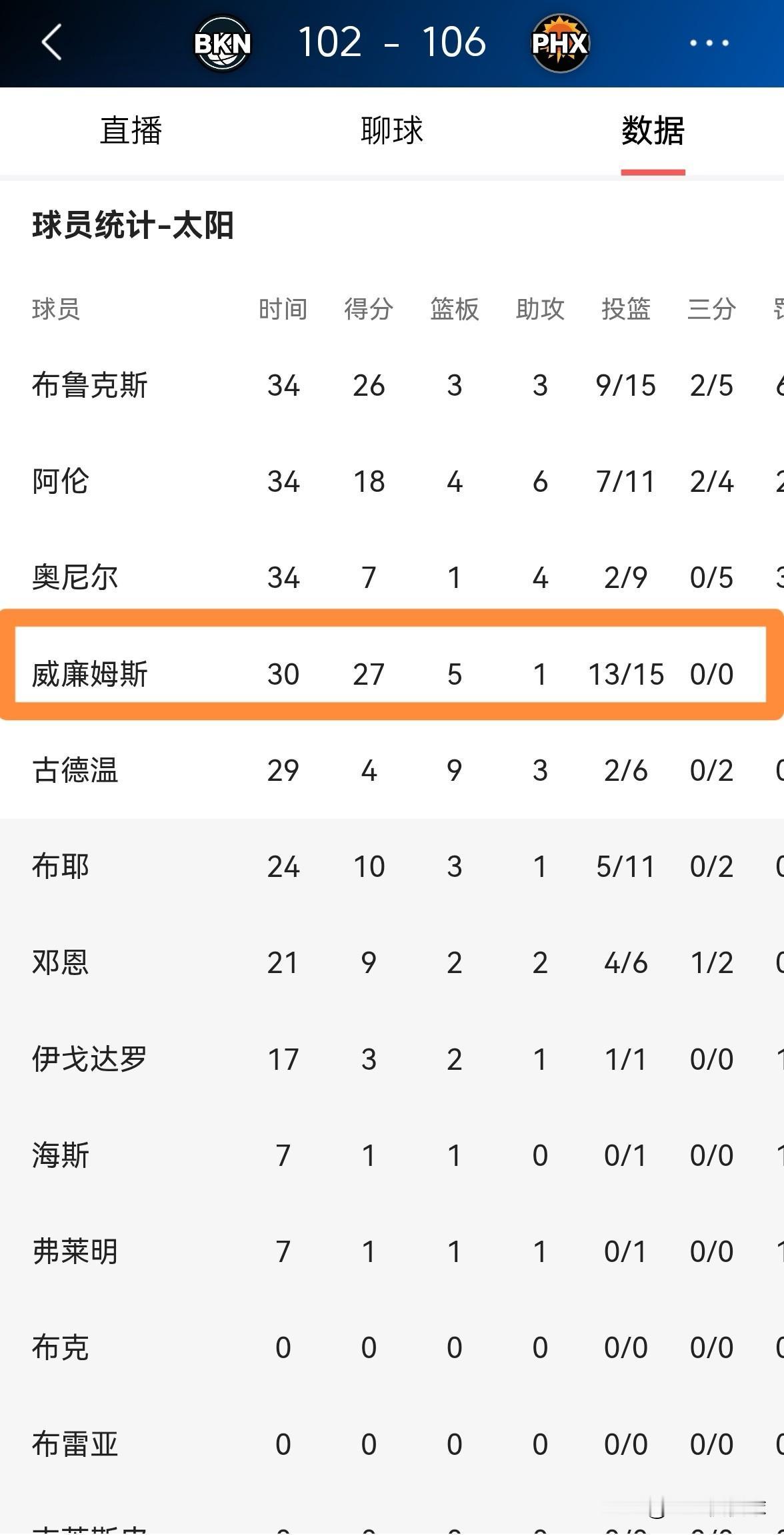 湖人管理层真是追悔莫及!在今天太阳主场以106:102战胜篮网的比赛中,太阳首发中锋马威打出了超级中锋的表现,成为了球队获胜的大功臣。 全场比赛下来,马威首发出战30分钟,投篮15中13,其中罚球1中1极其高效的砍下27分,还有5篮板1抢断1盖帽,他的场上正负值为+7。 我相信当湖人管理层看到马威的出色表现后,他们一定追悔莫及。如果上赛季湖人在关于马威的交易中没有反悔,那么湖人本赛季的战绩一定会更加出色。