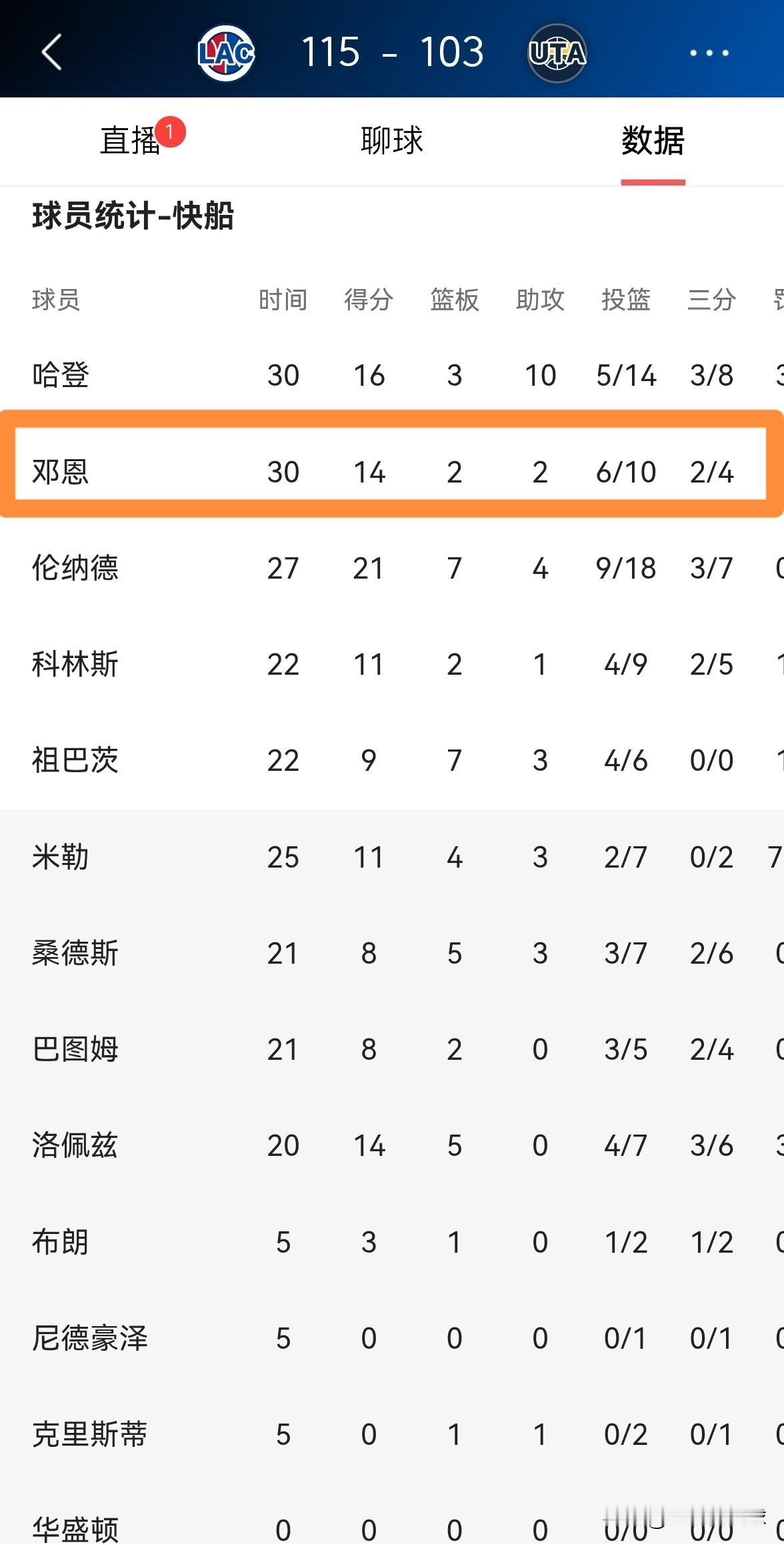 我必须要怒赞快船大将邓恩的抢断能力!在今天快船客场以115:103击败爵士的比赛中,邓恩疯狂的送出了5次抢断,展现出了超强的抢断能力。 整场比赛下来,邓恩首发出战30分钟,投篮10中6,其中三分球4中2非常高效的得到14分,外加2篮板2助攻5抢断,他的场上正负值为+15。 尽管邓恩的进攻能力比较一般,但是他的防守能力绝对是联盟的顶级水准。