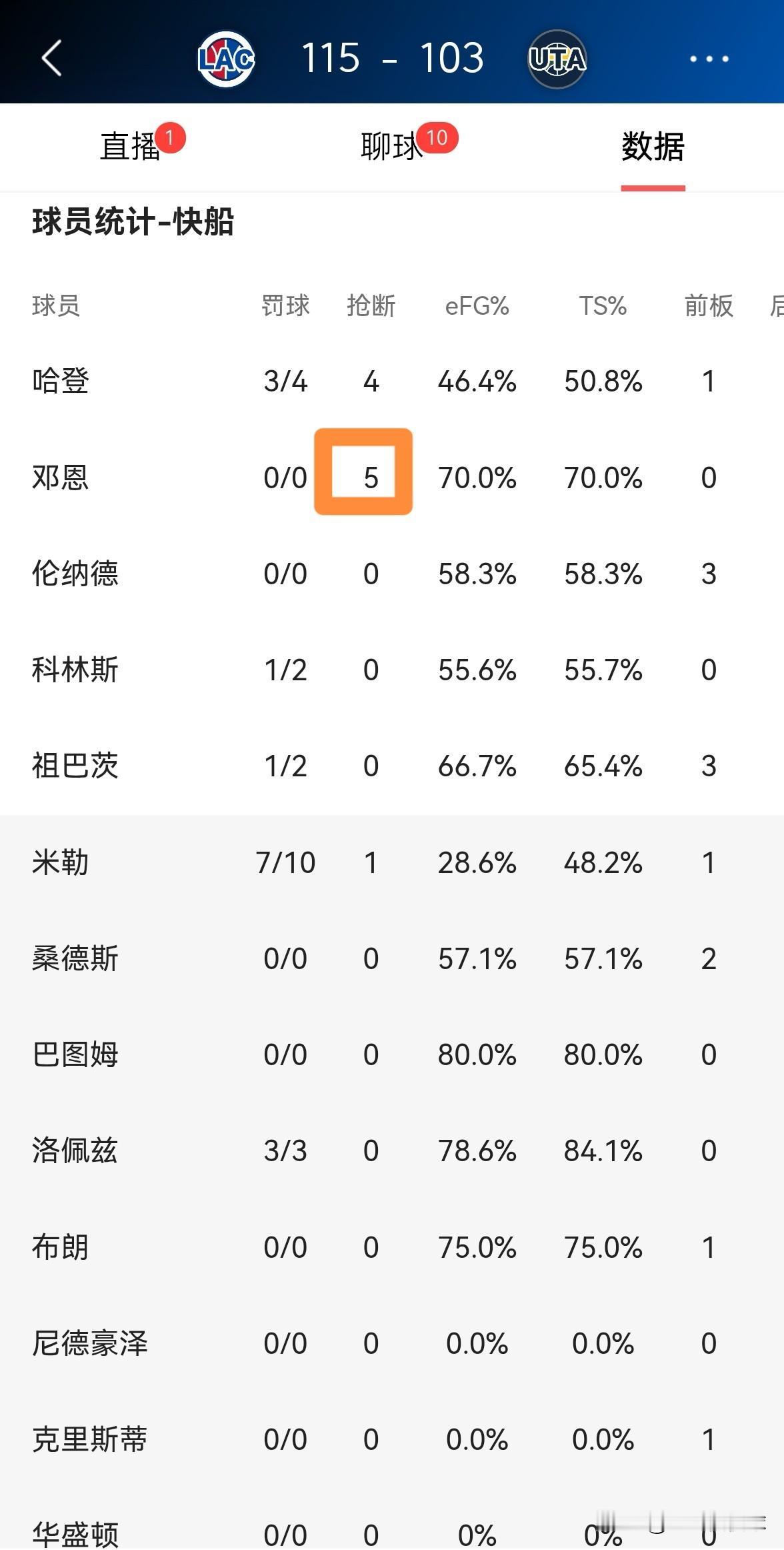 我必须要怒赞快船大将邓恩的抢断能力!在今天快船客场以115:103击败爵士的比赛