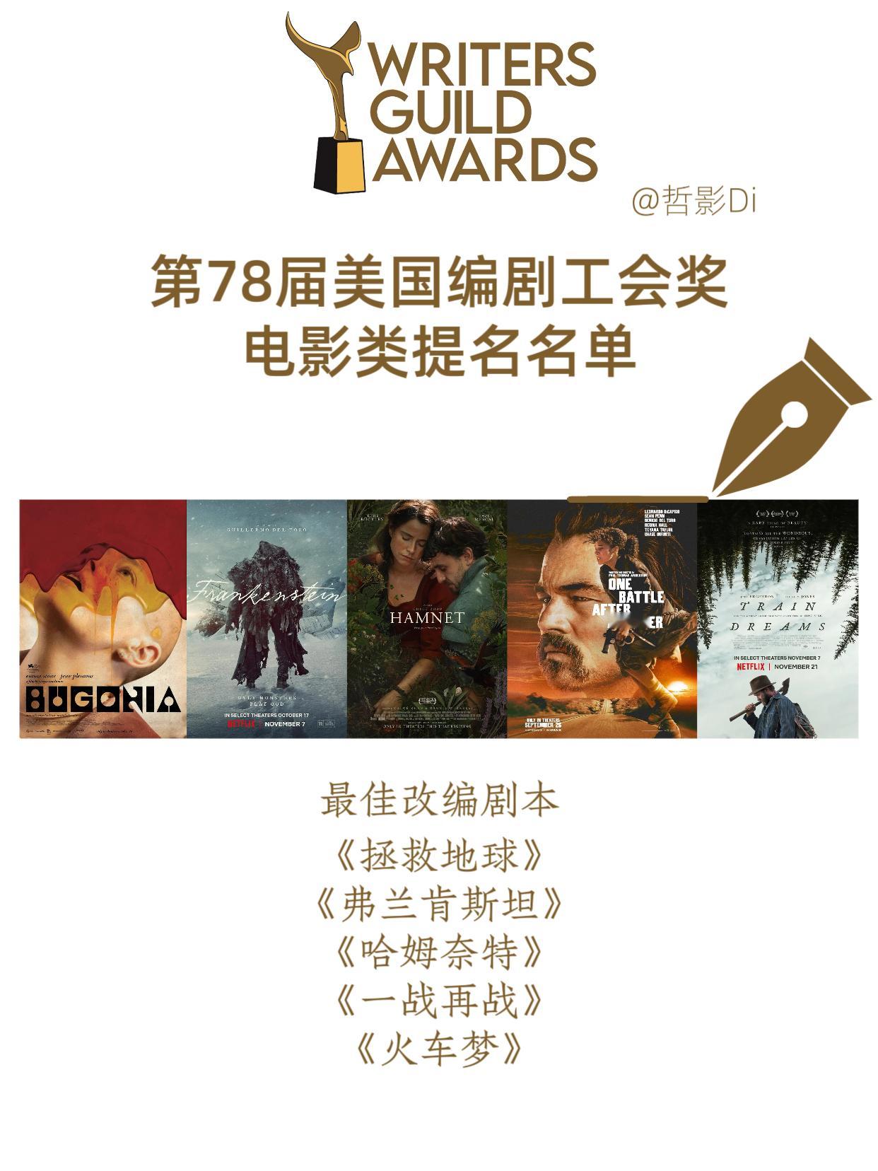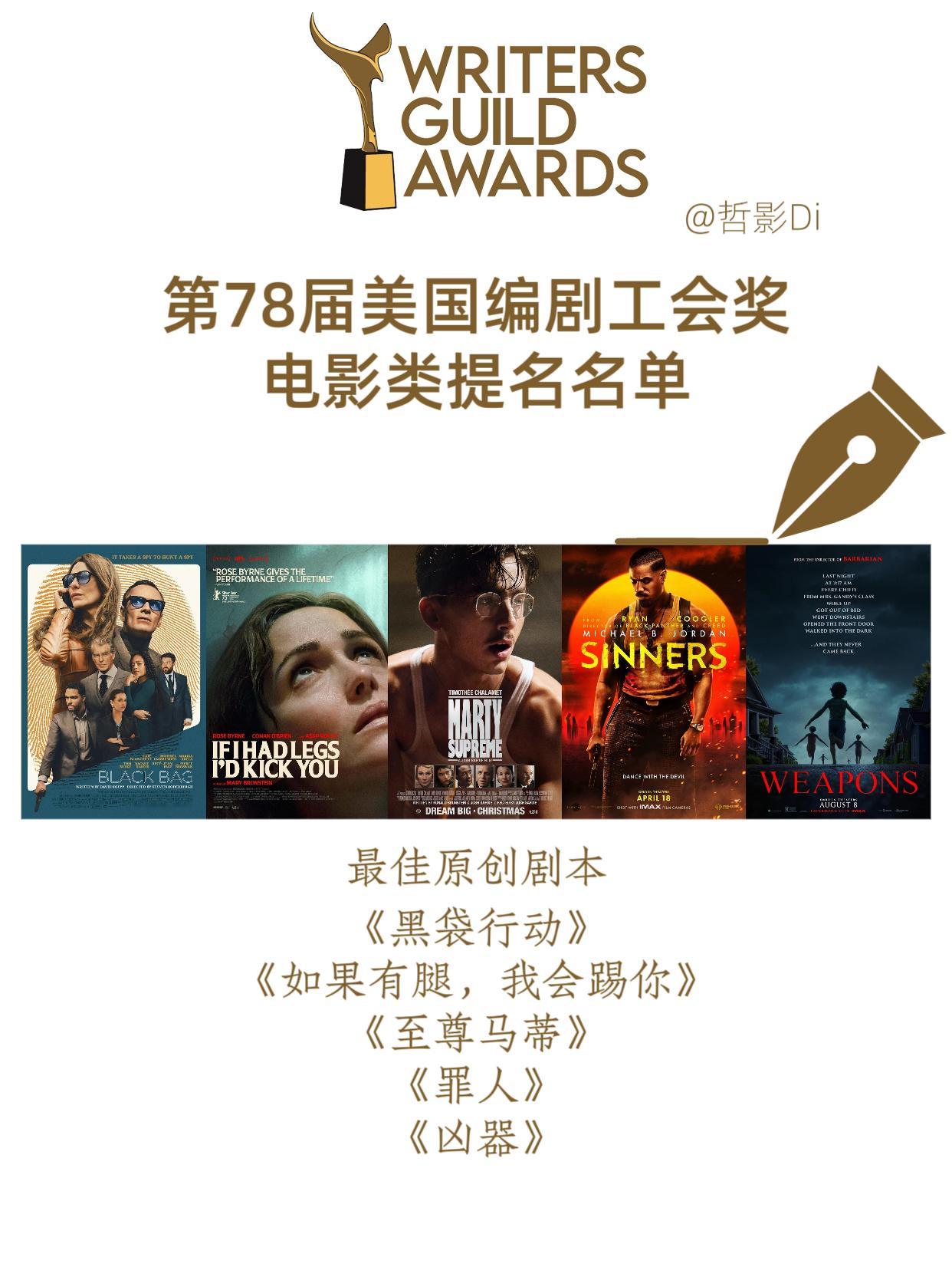 第78届美国编剧工会奖公布提名名单,《罪人》《至尊马蒂》《一战再战》《哈姆奈特》等热门影片均获提名,本届编剧工会奖将于3月8日揭晓。以下为提名名单↓ ↓ ↓最佳原创剧本《黑袋行动》《如果有腿,我会踢你》《凶器》 《至尊马蒂》《罪人》最佳改编剧本《一战再战》《哈姆奈特》《弗兰肯斯坦》《火车梦》《拯救地球》