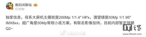 博主数码闲聊站在微博透露,某厂商的母系大屏手机将搭载2亿像素1/1.4英寸三星HPx主摄。该博主表示,这款手机还将配备5000万像素1/1.95英寸索尼IMX8XX潜望式长焦镜头、5000万像素常规小底超广角镜头,并有联名影像加持,内部暂定于第二季度发布。结合博主暗示及评论区猜测,预计该机型为小米17 Max。(新浪科技)