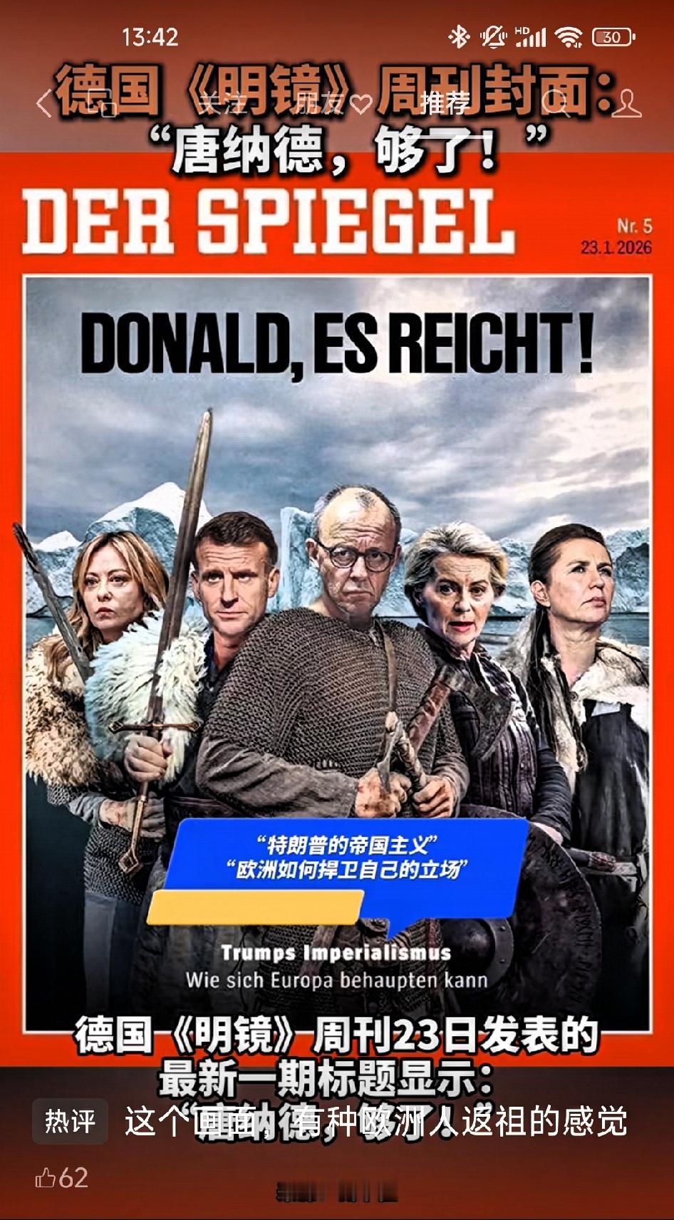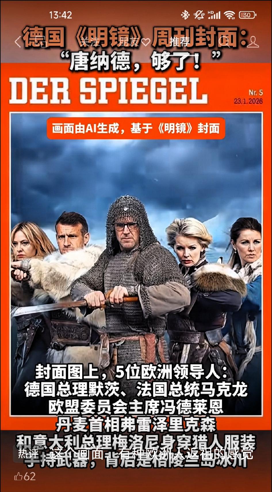 德国明镜周刊发文:特朗普,够了! 5位欧洲领导人身着猎人服装,背景是格陵兰岛的冰山,象征他们会团结一致对外。 殊不知本就一团散沙、各怀心思。无论欧盟还是北约,都是美国人说了算。与其这样大张旗鼓演戏,不如把格陵兰岛赠与美国。丹麦其实没有损失什么,北约内部也能相安无事。 大家觉得呢?可以亮出你的观点!