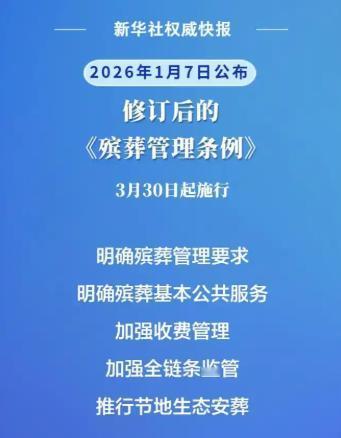 新的殡葬制度将于2026年3月30号执行,大概意思就是:一切从简,城里可以选火葬,山区可以选土葬,但是要进公墓,想搞树葬花葬的国家还给发钱。以后火化、运输这些基础服务,要么免费,要么全国统一价,价格明晃晃摆出来,谁也别想乱要钱。     这次改革的消息一出来,就引起了不少人的关注,毕竟,这些年一提到办丧事,很多人心里都犯怵,有人感叹“活着难,死更难”,不是空话。一场葬礼,价格比婚礼还高。   遗体接运按公里加价,普通骨灰盒加个“环保”标签就变成高价货,告别厅、鲜花布置这些项目不买不行,丧事本该是送别和思念,却被各种收费项目折腾成了商业活动。     农村的情况更复杂。很多地方还是土葬,不少人为了“风水”或者“面子”,占地修坟,浪费耕地,还容易和邻里闹矛盾,攀比成风,大操大办,有的家庭为了办丧事花光积蓄,甚至背上债。无论是城市里的高价套路,还是农村的人情负担,都让人喘不过气。     这些老问题,新规这次都对上了号,它的目标很明确,就是让殡葬回归“服务”而不是“生意”。最核心的调整是价格和服务标准。今后,遗体接运、存放、告别仪式、火化、骨灰寄存这五项基础服务,全国都要统一政府指导价。   收费公开,只算成本,不得暴利。服务机构必须把所有收费项目明明白白公示,清单外的费用老百姓直接拒绝付,乱收费、强制消费的空间,将彻底被封死。     对困难家庭,新规更有温度。城乡低保户、特困供养人员、脱贫户这三类群体,可以享受五项基础服务全免政策,还能领取一笔不低于当地月最低工资三倍的丧葬救助金,这样一来,再穷的家庭也能体面地安葬亲人。     在安葬方式上,新规没有“一刀切”。城市以火葬为主,山区、农村在条件允许的前提下可保留土葬,但所有遗体或骨灰必须进入公墓或统一规划的墓区,这样既尊重习俗,又避免乱占土地。   对于愿意选择生态安葬的家庭,比如树葬、花葬、草坪葬或海葬,国家还会给予现金补贴,标准从500元到1000元不等,在浙江、广东等发达地区最高能达到8000元。   甚至迁坟或将老坟改为生态墓,也能获得不同额度的补助,像北京、杭州等城市,还会免费发放可降解骨灰盒,让绿色安葬真正落地。     有人担心,政策能不能落实?这次管理措施的落实有明确保障,国务院要求各地在2026年2月底前公布本地细则,包括收费标准和补贴方案。   群众办手续前,只要去民政局官网或者乡镇民政所,就能查到哪些项目免费、哪些收费。宗旨就是公开透明,不留漏洞,,不仅如此,政策还明确,持居住证的外地居民享受与本地人同等待遇,少数民族的习惯也受法律保护。     这次改革,真的做到了“管、保、引”三位一体。“管”,就是把价格乱象切断;“保”,是兜底困难家庭;“引”,则是通过补贴推动绿色文明的殡葬方式。   一方面遏制殡葬行业混乱,另一方面树立了节俭、环保的新风向,过去那种讲排场比面子的习惯,该让位给理性、体面的送别。     等到2026年3月30日新规正式落地时,不论城市还是农村,不论家庭贫富,丧事的流程都将更加清晰,支出更加可控。“逝有所安”不再停留在口头上,而是靠制度保障实现。一个让人能安心又不再“死不起”的时代,会由此开启。