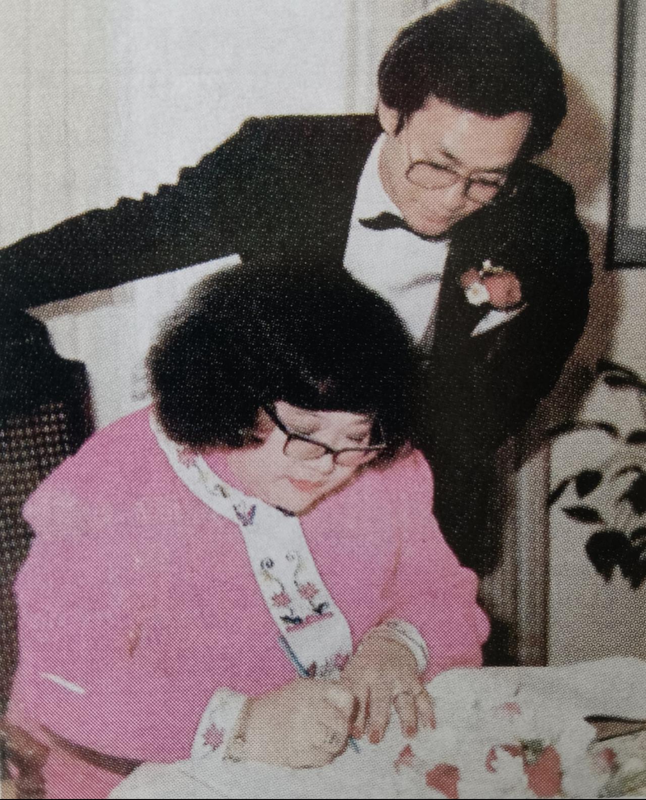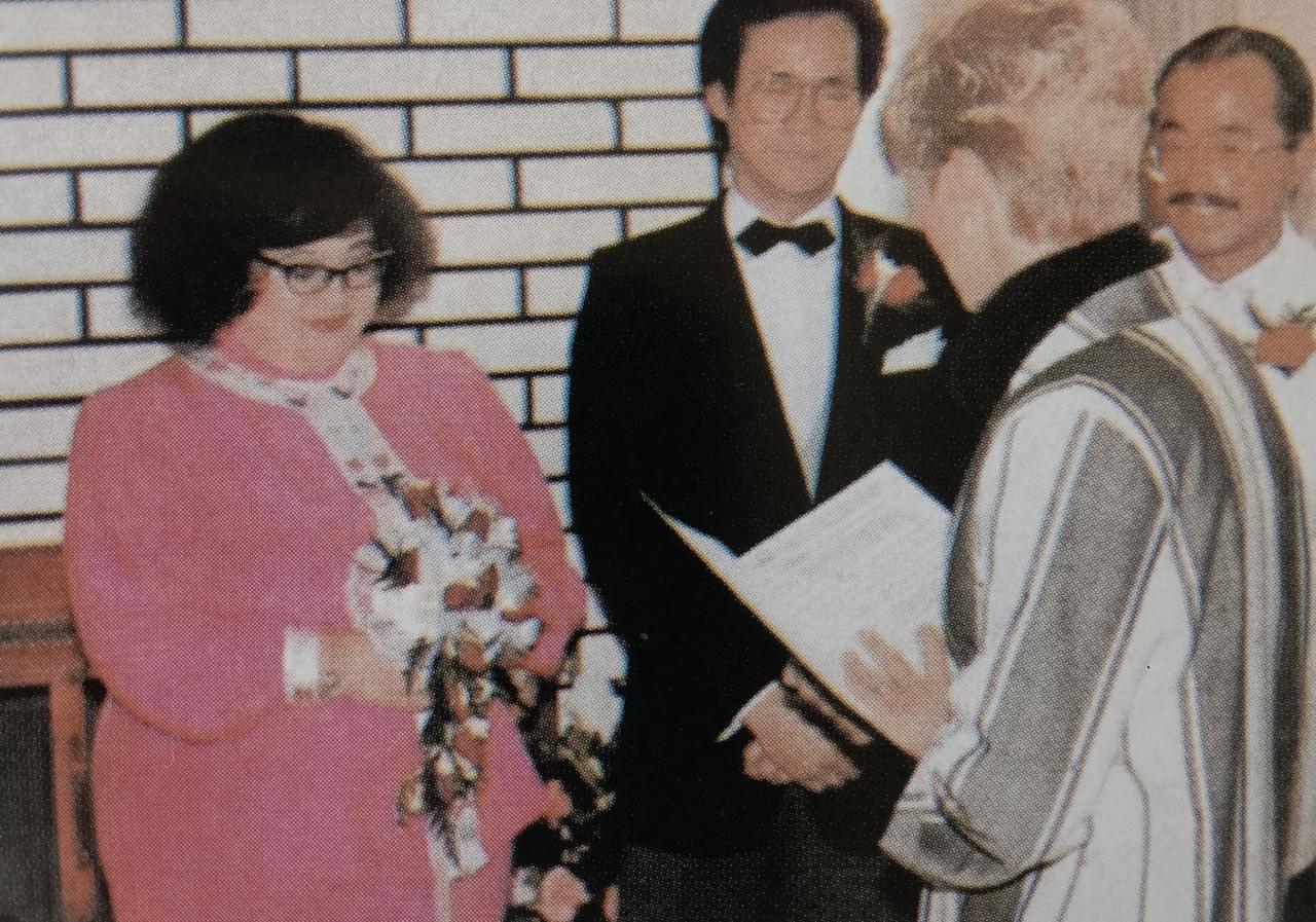 1985年,郑少秋与沈殿霞在温哥华举行婚礼,当天郑少秋身穿西服套装看上去英俊非凡,沈殿霞虽然没有披上白纱,但一身玫红色套装也衬得她是温婉娇俏。 婚礼仪式上,两人一起签下婚书,正式结为夫妻,还在大家的见证下互相交换戒指。 交换戒指的环节中,沈殿霞满脸娇羞,展露出小女人姿态,郑少秋虽然低着头但也双目含情。