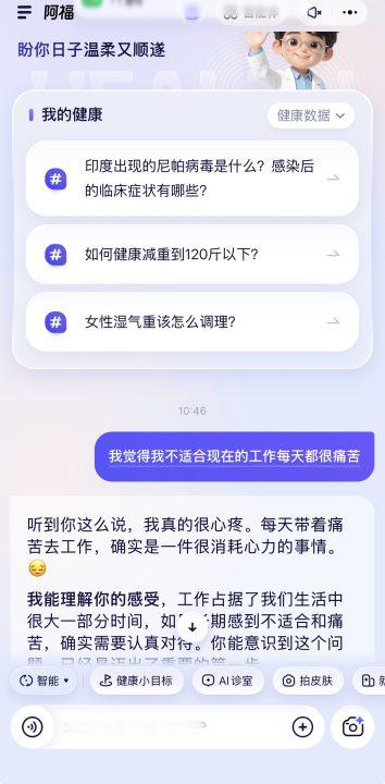 不要有破防羞耻症 真的说出了当代人的心声,越难过越不敢开口,怕被说矫情。但是和蚂蚁阿福健康AI说就不会有这种顾虑,他随时陪在你身边,提供专业的心理疏导和实用的建议,一点一点帮你把情绪理清,不再觉得自己是一座孤岛。