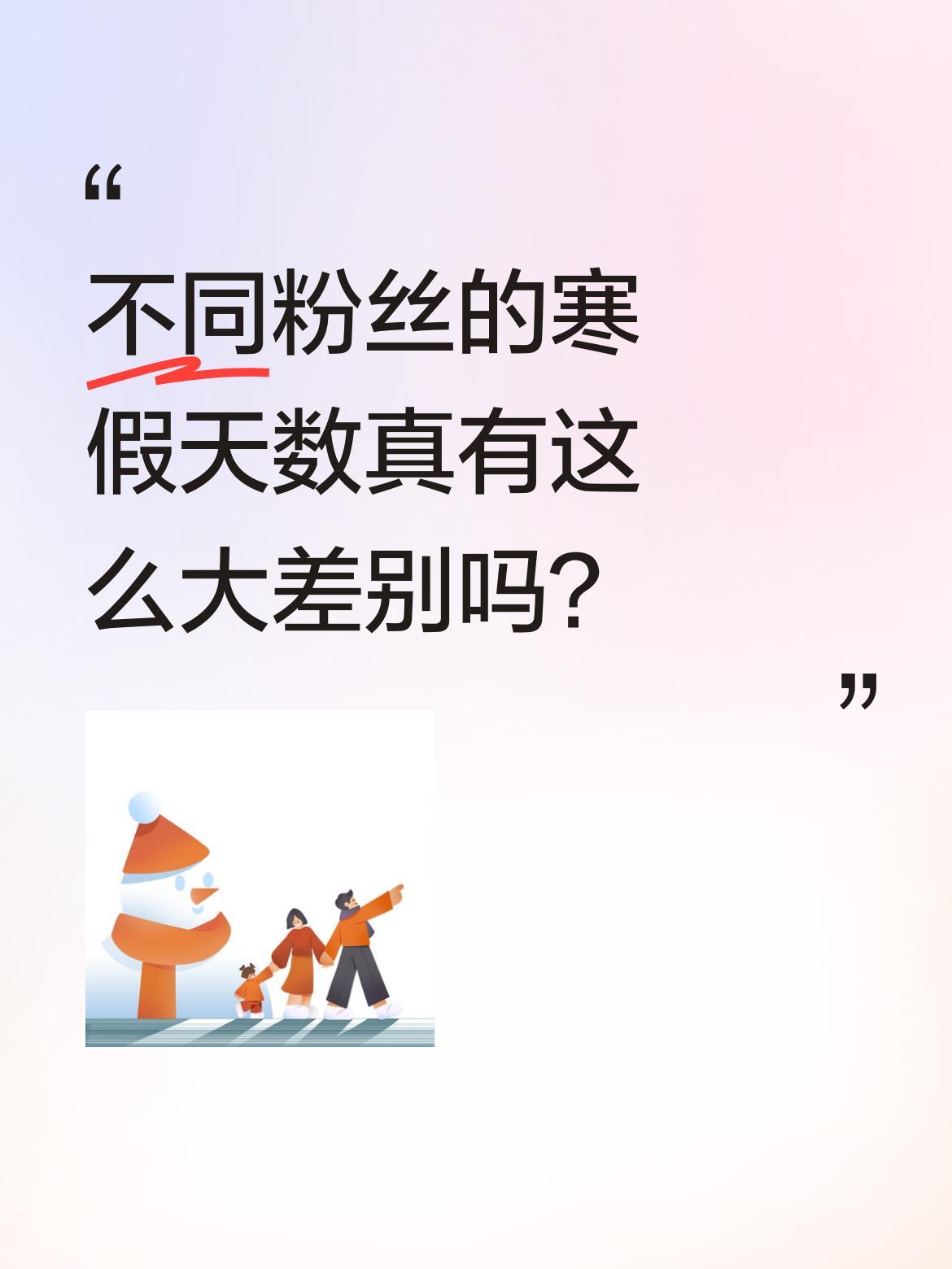 不同粉丝的寒假天数真有这么大差别吗? 最近有个有趣的话题:不同粉丝对应的寒假天数。黑粉8天,路人18天,新粉90天,而真爱粉直接180天放半年。虽然是玩笑,但也反映出大家对假期的期待。你们觉得这样的"粉丝专属假期"合理吗?你理想的寒假有多少天?