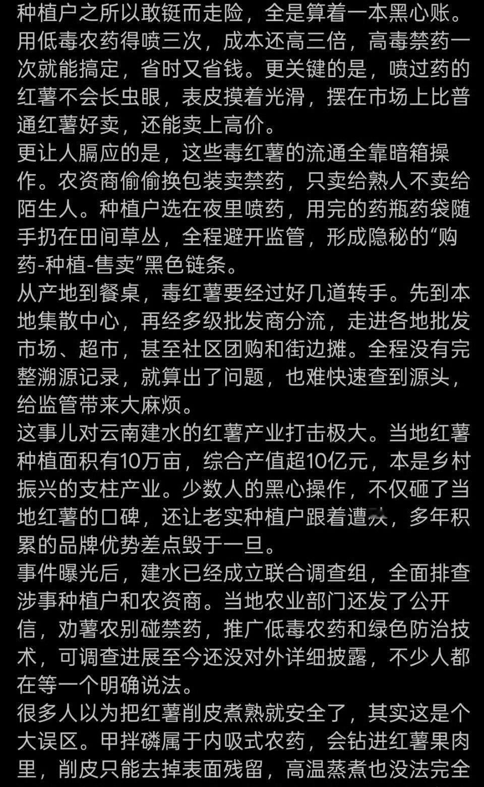 应该惩罚那些买卖毒农药的人! 还记得,之前一对夫妻吃菜中毒,双双进icu。 而这几天央视还曝光了毒农药违规使用链条,克百威。 克百威是禁用于蔬菜瓜果的高毒农药。 不知道这毒红薯都流向了哪里? 毒食品 农残农药