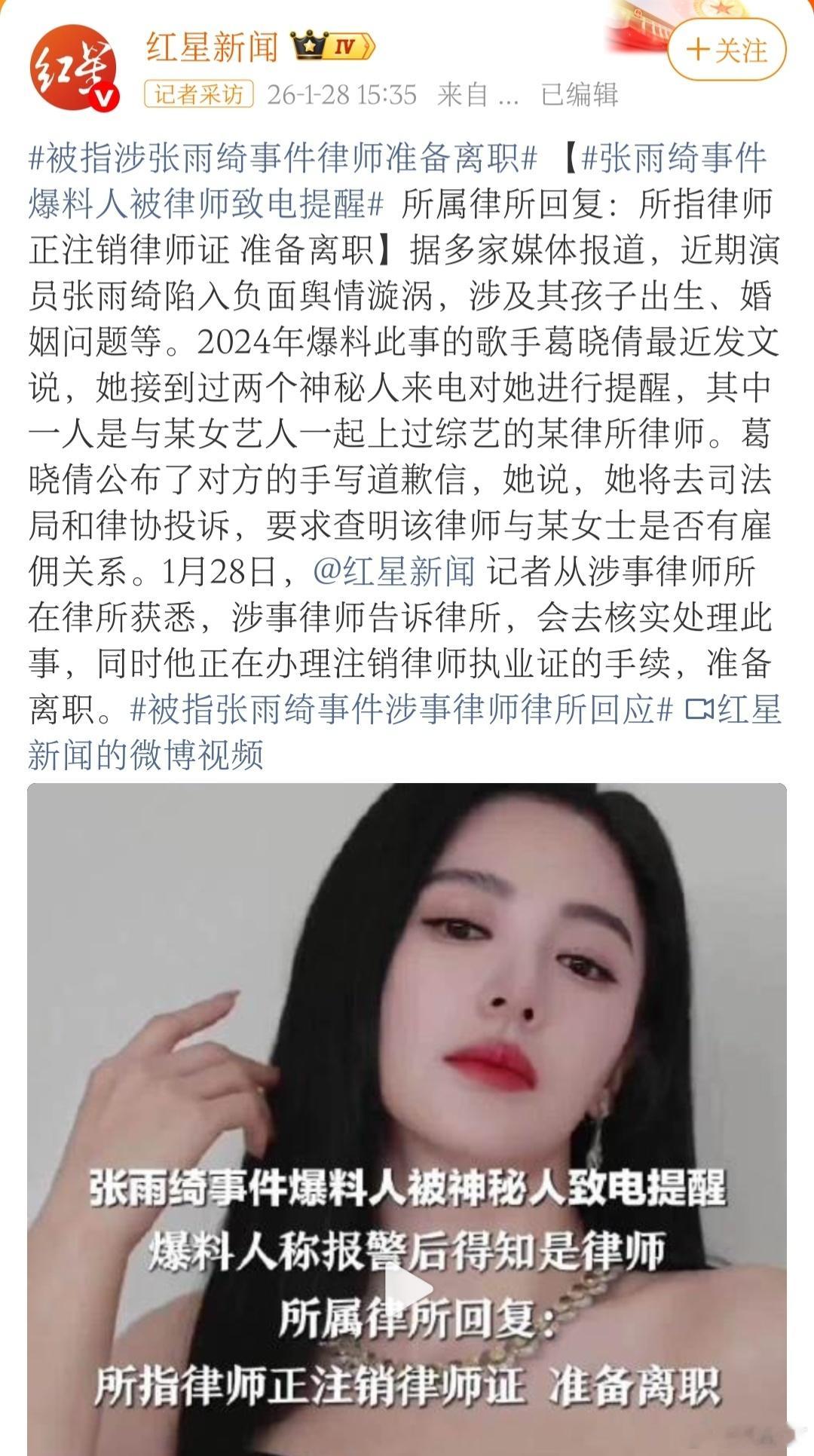 被指涉张雨绮事件律师准备离职红星新闻还真是看热闹不嫌事大啊。在葛晓倩爆料开盒她的两神秘人士已经找到,真实身份为律师,其中一位疑似与张雨绮有关后。红星新闻记者直接打到涉案律师所在的律师事务所。结果被告知,相关律所正在处理此事,此外,涉案律师正在注销律师执业证,即将离职。曝张雨绮塌房背后有推手