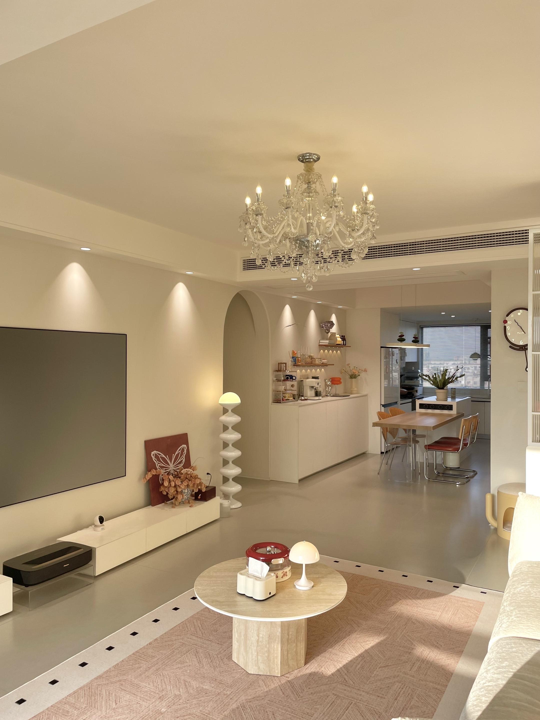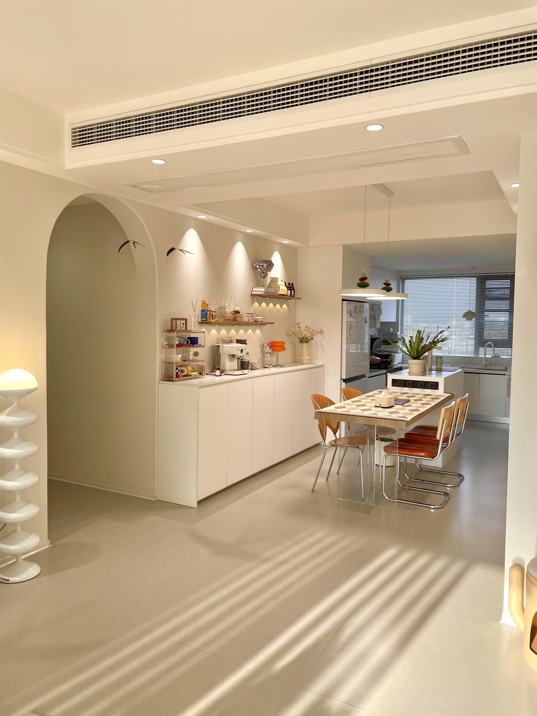 乳胶漆还在纠结的,可以像我这样做。客餐厅墙面通刷杏子灰,全屋顶部刷珍珠白,卧室背