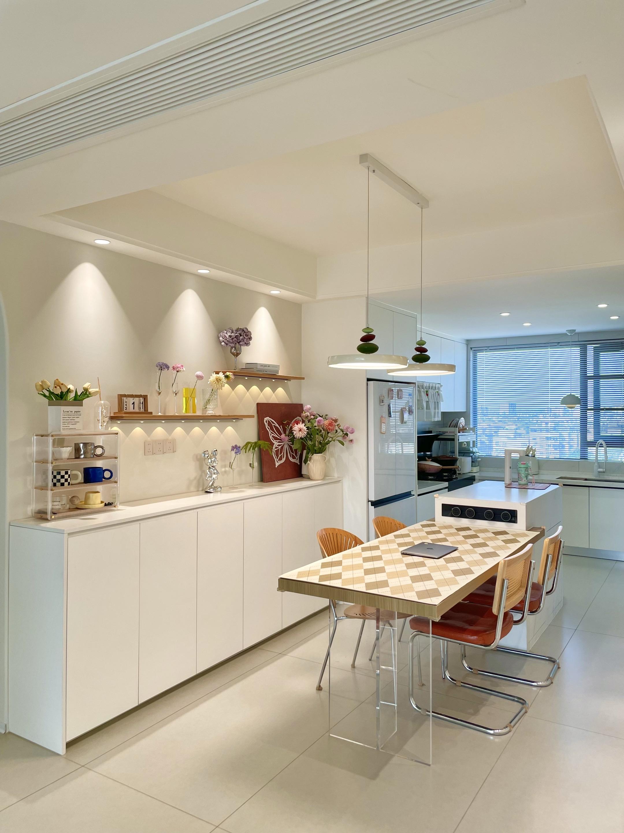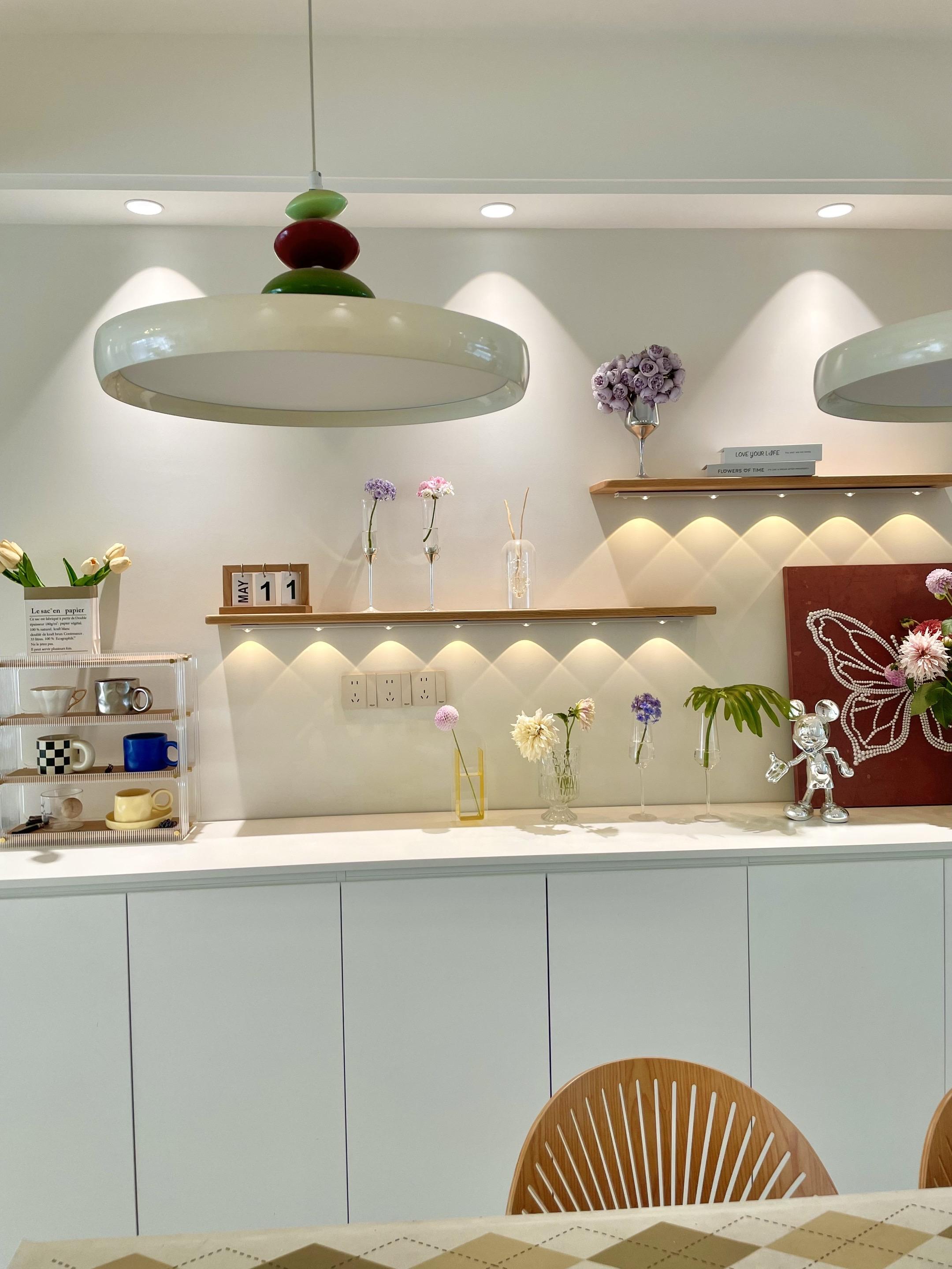 无吊柜餐边柜|原来那么多人喜欢啊~餐厅开间只有2.76m 没有做千篇一律的定制满墙柜子 而是选择了半高的餐边柜 尺寸:长2.6m高1m深40cm 上面适当空间留白,不压抑 搭配上一字板置物架,可以收纳一些物品 适配很多种家装风格 需要可以参考~
