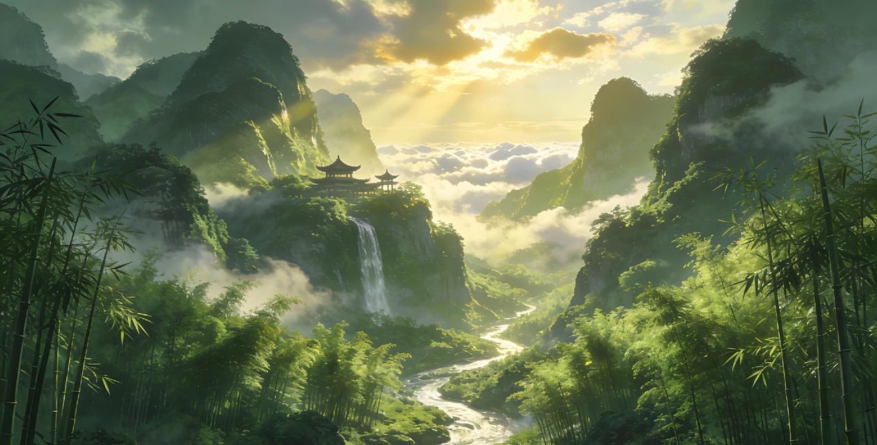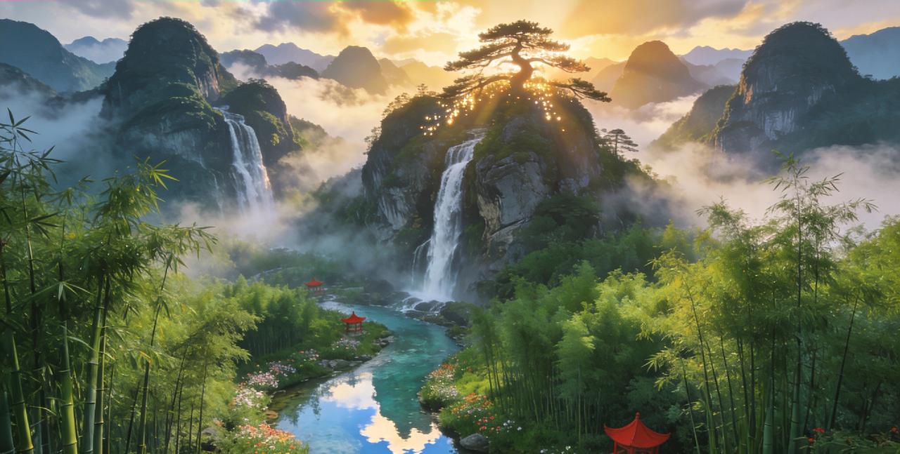 图1:云雾缭绕的青山间,飞瀑如银链倾泻,湖面倒映着霞光,宛如仙人居住的秘境。 图2:奇峰耸立,山间点缀着粉白的花树,云雾在山谷间流动,仿佛一幅灵动的水墨画卷。 图3:落日余晖洒在平静的湖面上,远处的山峦若隐若现,岸边的古亭与山水相映,意境悠远。