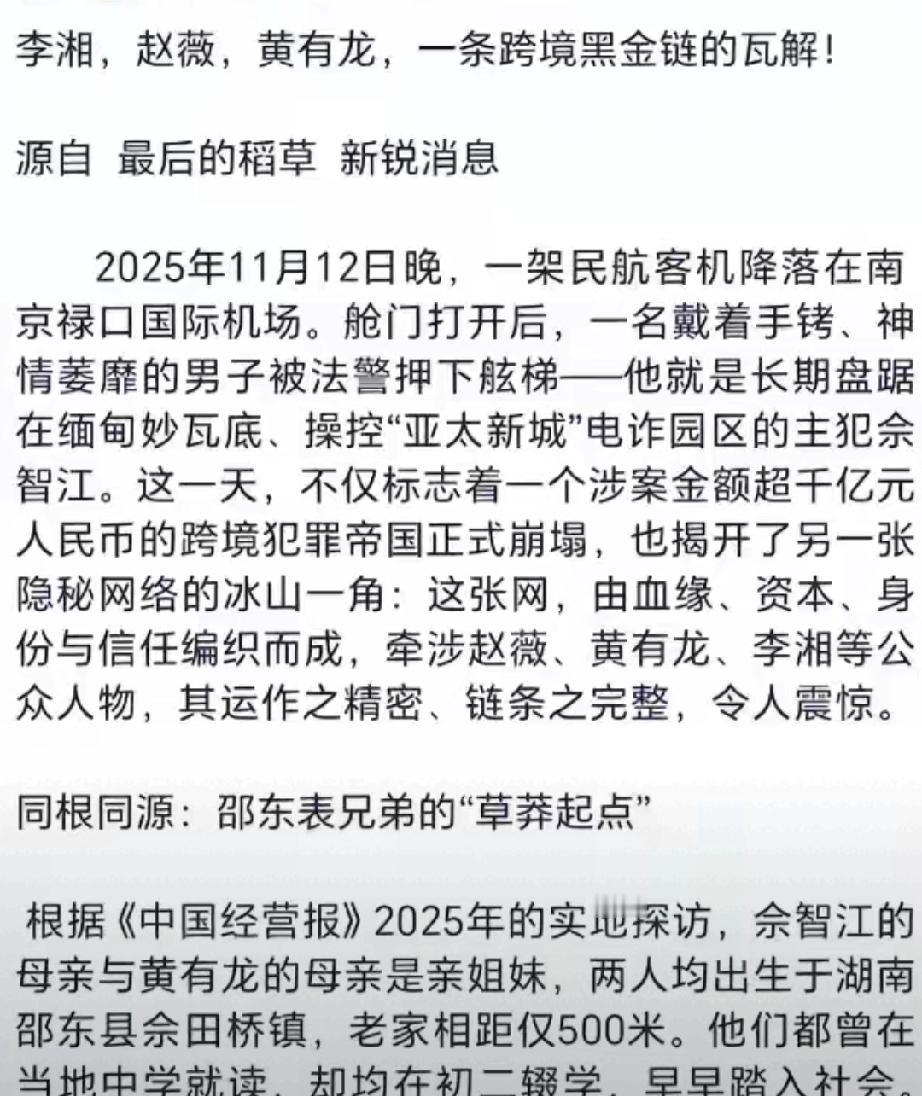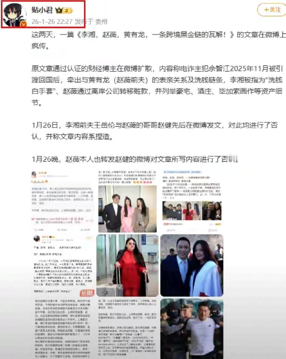 曾经的“女版巴菲特”赵薇,如今竟和李湘一起陷入刑事传闻? 近日李湘账号突然被封,引爆全网猜测,甚至有流言称两人涉及缅北非法交易,赵薇因此再次深陷泥潭。 即便两年前已官宣与黄有龙离婚,试图切割过去,但因直播卖货、资本运作留下的负面滤镜,让她一旦沾上风波便难以脱身。 虽赵薇哥哥与王岳伦已紧急辟谣,但这波“躺枪”再次印证:一旦信誉破产,呼吸都是错。 从爆火的“小燕子”到被封杀的劣迹艺人,赵薇的下场警示所有名人,触碰法律红线必遭反噬。吃瓜需理智,但敬畏法律、爱惜羽毛,才是唯一的生路。 免责声明:文章描述过程、图片都来源于网络,此文章旨在倡导社会正能量,无低俗等不良引导。如涉及版权或者人物侵权问题,请及时联系我们,我们将第一时间删除内容!如有事件存疑部分,联系后即刻删除或作出更改。 本文内容信息来源:联合日报、百度百科、【贴小君个人账号】 黄景瑜上太空300万3分钟值吗 知名男星吴奇隆“落户”宁波