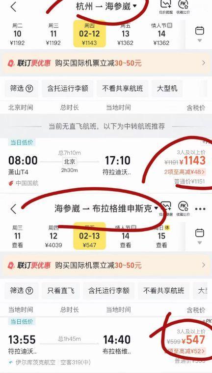 女生春运回家途经俄罗斯比直飞便宜【东北女生晒春运“出国回家”攻略:连飞俄罗斯两地再坐船回黑龙江,比直飞还便宜】当事人回应春运回家跨国转机更便宜据上游新闻报道:近日,一位在杭州工作的黑龙江女生小林在网上晒出自己的春运返乡计划:利用中俄互免签证政策,从杭州先飞往俄罗斯,最后坐船回到黑龙江。相关网帖引发热议。此外,还有东北网友晒出杭州先飞韩国济州岛再到沈阳的回家路线。1月28日,小林告诉上游新闻记者,自己的家距离中俄边境就几百米,所以想出了这样的回家方式,不仅比直飞能够省下五六百元,而且还能到国外游玩一圈。“这是我原创的回家方式。”刚刚大学毕业的小林是黑龙江黑河人,目前在杭州从事自媒体工作,她告诉上游新闻记者:“我们家在边境,离俄罗斯只有800米。因为哈尔滨旅游热,现在过年回家机票都很贵,而且没有直飞,要在北京或者哈尔滨中转。从哈尔滨坐火车到家还要一晚上,所以我就想,前段时间中俄免签了,是不是可以飞到俄罗斯,然后从对岸坐出入境的气垫船回家。”小林介绍,自己的计划是先飞往俄罗斯符拉迪沃斯托克(海参崴),再转机至布拉戈维申斯克(海兰泡),最后坐船回到黑河,“机票加上坐船入境黑河的费用是1840元,但如果从杭州飞黑河机票则是2340元。”小林还表示,自己还会借这个机会在俄罗斯游玩一圈,因为也是第一次,会用Vlog的形式记录这段返乡之旅。1月28日上午,上游新闻记者在相关平台看到,目前2月12日从杭州飞往黑河的航班机票要2200元,需在北京中转超过7小时,直飞哈尔滨的机票已经超过2100元。而飞往符拉迪沃斯托克(海参崴)的机票只需要1200元,不过仍需在北京中转3小时左右。上游新闻记者注意到,小林的帖子有不少网友点赞,有网友表示:“蹲一个,看这个行程靠不靠谱。”小林说:“等我出完Vlog,没准第二年就会有人这样回去。”上游新闻记者从黑河海事局了解到,2025年12月1日,中俄互免签证政策正式生效,随着黑龙江冰雪旅游热度攀升,黑河市凭借“2分钟”跨境区位优势与极寒气候特色,迅速成为中俄跨境冰雪旅游热门目的地,自2025年10月27日气垫船客运首航以来,跨境旅客数量持续攀升,截至今年1月4日,累计达8.84万人次,俄方旅客占比约53%。上游新闻记者看到,还有不少在外地工作的东北网友在小林的评论区询问是否有其他春运返乡路线。同样也在杭州工作的哈尔滨女生小孙就提供了自己的计划,她打算2月5日从杭州飞往韩国济州岛玩几天,9日再从济州岛飞往沈阳,在沈阳玩几天,再坐高铁回哈尔滨。小孙告诉上游新闻记者:“从杭州到济州岛的机票比较便宜,加上济州岛的地理位置已经比较靠近东北了,所以就想到了是不是可以这样走。”“正常机票(杭州飞哈尔滨)要1600元左右,现在只需要1000元左右,其他开销就丰俭由人了。虽然省不了多少,只不过同样的钱,可以在济州岛玩几天,还可以买点东西,一些商品的差价就可以值回票价了。还可以在沈阳吃吃美食,适合放假比较早又比较爱玩的人。”小孙说。此外,上游新闻记者注意到,南航黑龙江分公司此前发布消息,哈尔滨至符拉迪沃斯托克(海参崴)直飞航线也已经于2025年12月23日正式复航,该航线每周二、六执飞,预计将持续至2026年3月28日。