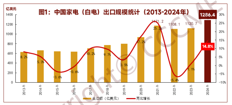 《2024年中国家电(白电)出口年度报告》显示,2024年,我家电产品(白电)累计出口1286.4亿美元,同比增长14.8%,连续四年超过千亿美元。各大家电品类及零件出口呈量额齐升的良好态势:空调、冰箱冷柜和洗衣机等大家电产品,以及大多数厨卫家电和环境家电产品全年累计出口规模均为近四年峰值水平。日本电视全军覆没了