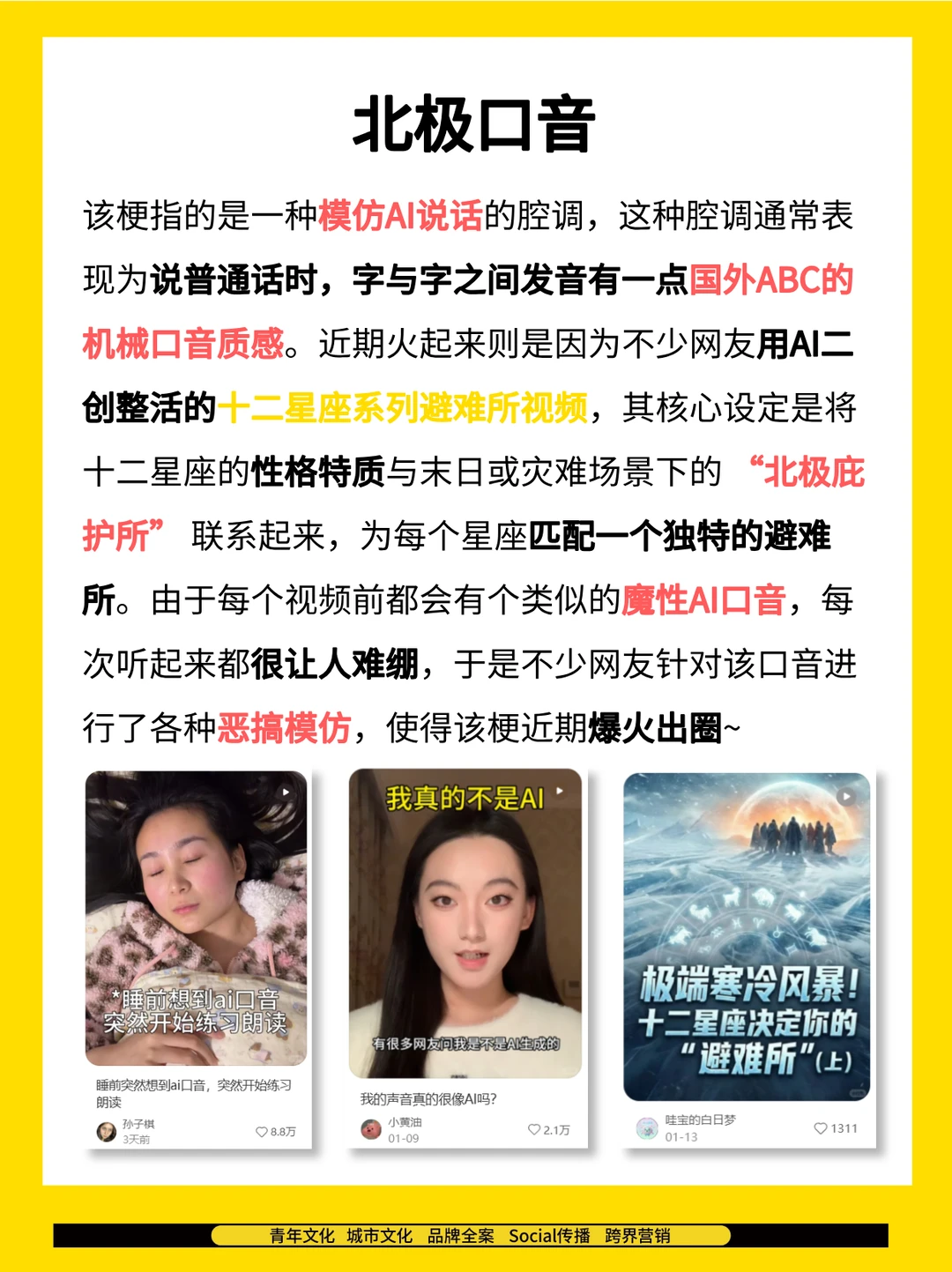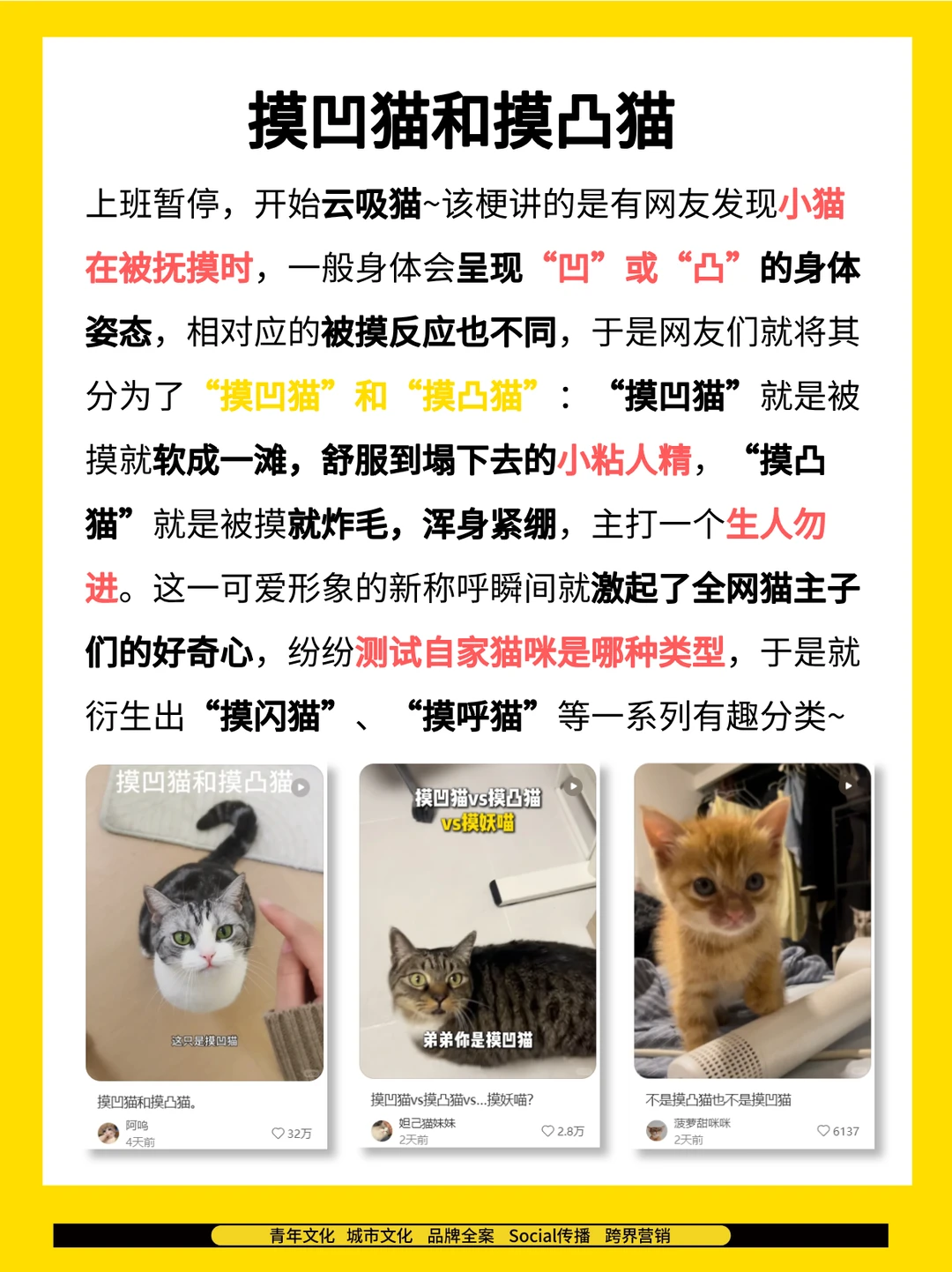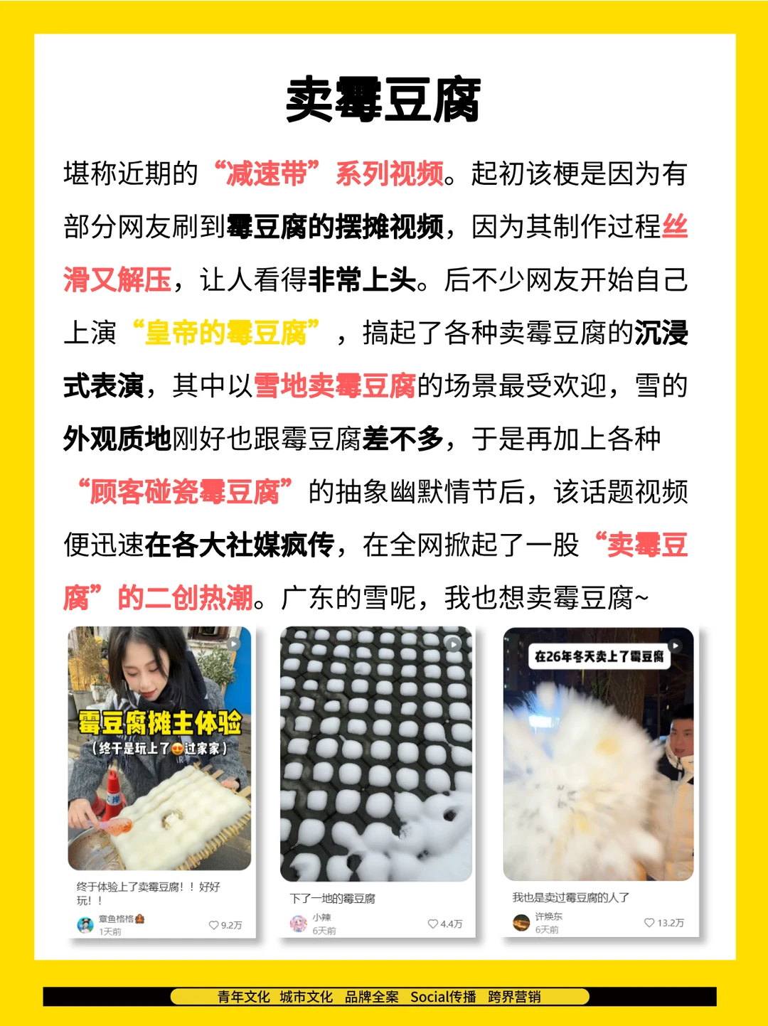🔎年轻人最近在关注什么? 热词热梗指南,带你走进年轻人的世界! 🔥人在广东,啥时下雪,我也想「卖霉豆腐」; 🔥别人家的猫是「摸凹猫和摸凸猫」,我家的上来就是“摸咬猫”; 🔥每次听到十二星座避难那个「北极口音」,我都很难绷; *图源网络 每周关注快活Lab工作室,后面会持续更新更多营销案例、行业研究、青年洞察等相关内容干货哦!