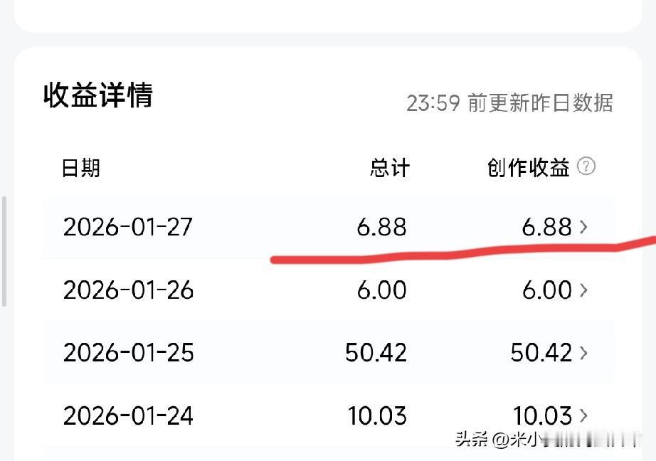 头条收益出来了,吓我一跳 今天的收益条差点让我原地破防!昨天吭哧吭哧写了4篇微头条,阅读量3.7万,本以为能小赚一笔,结果一看收益——6.88元! 这单价跌得比坐过山车还猛,前几天还有过单日50块的高光时刻,现在直接被打回原形。看着收益曲线像坐滑梯,说不失落是假的。 但在头条摸爬滚打这么久,我也算明白了:这行拼的就是心态。有爆款起飞的狂喜,就有数据扑街的落寞。与其纠结那几毛几分,不如把它当成一场修行。毕竟,能把文字变成真金白银,本身就已经赢过很多人了。