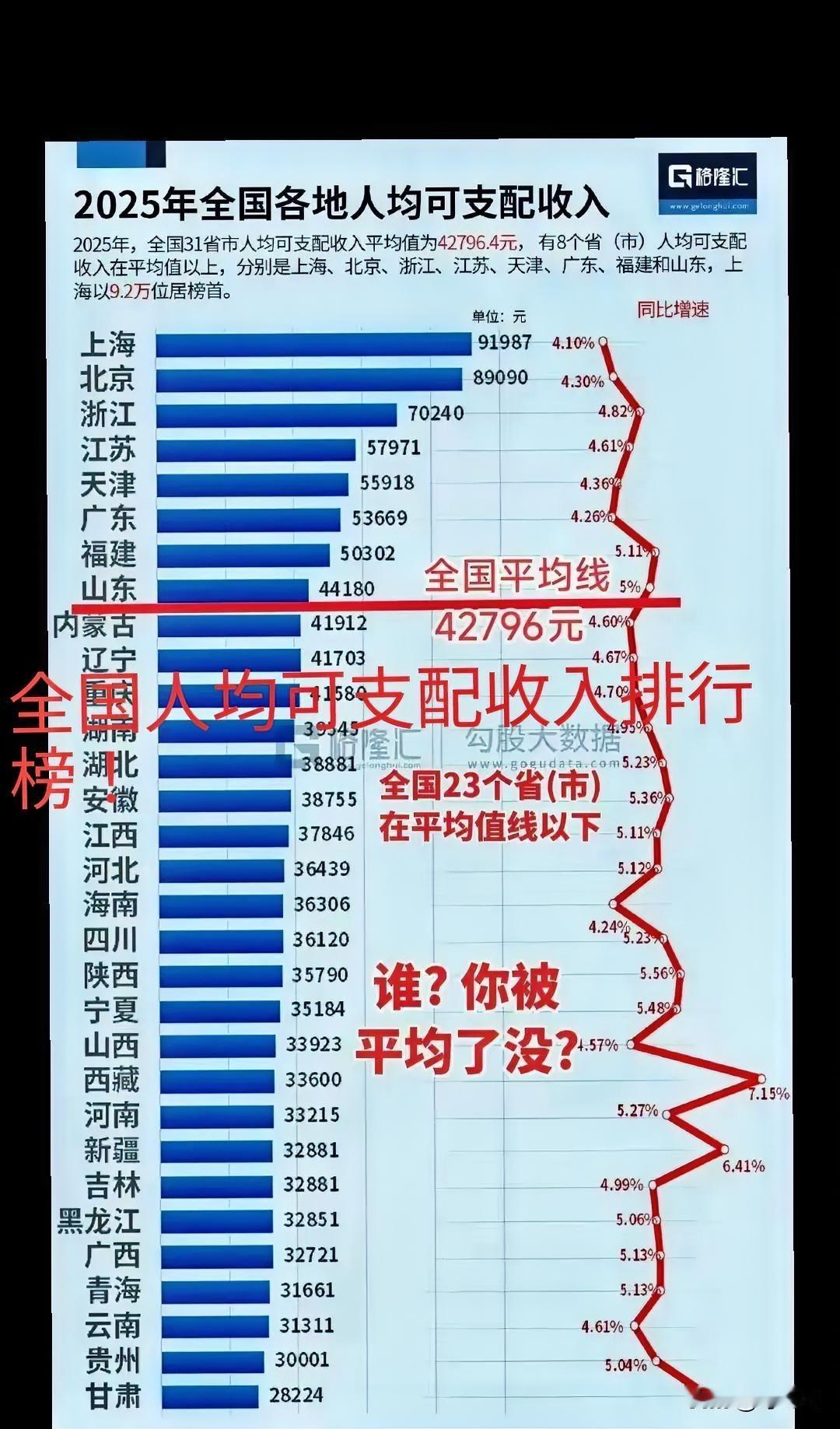 刚刚公布!2025年全国各省市人均可支配收入排行榜揭秘!看完了泪目!31省市都有,快来看看你家乡超过平均值了吗?令人比较意外,23个省市区低于平均值!大多数地区在均值以下,沿海地区和内陆地区经济差异非常大!西部地区平均经济收入和沿海地区相比较,相差太大了!看看河南省、河北省、重庆市、四川省GDP排行榜前几名,但看看人家可支配收入,都快垫底了!眼泪汪汪。我辈当努力争取,早日登上均值以上。速速围观揭秘详细内容。[流泪][流泪][捂脸][捂脸] 你觉得有哪些看法呢?欢迎关注@叮咚云 将优先为粉丝职业规划指导,1对1咨询是付费服务,为你定制最适合的就业择业方案!欢迎留言交流讨论。[来看我][来看我] 免责声明:图片来自网络,仅供参考!