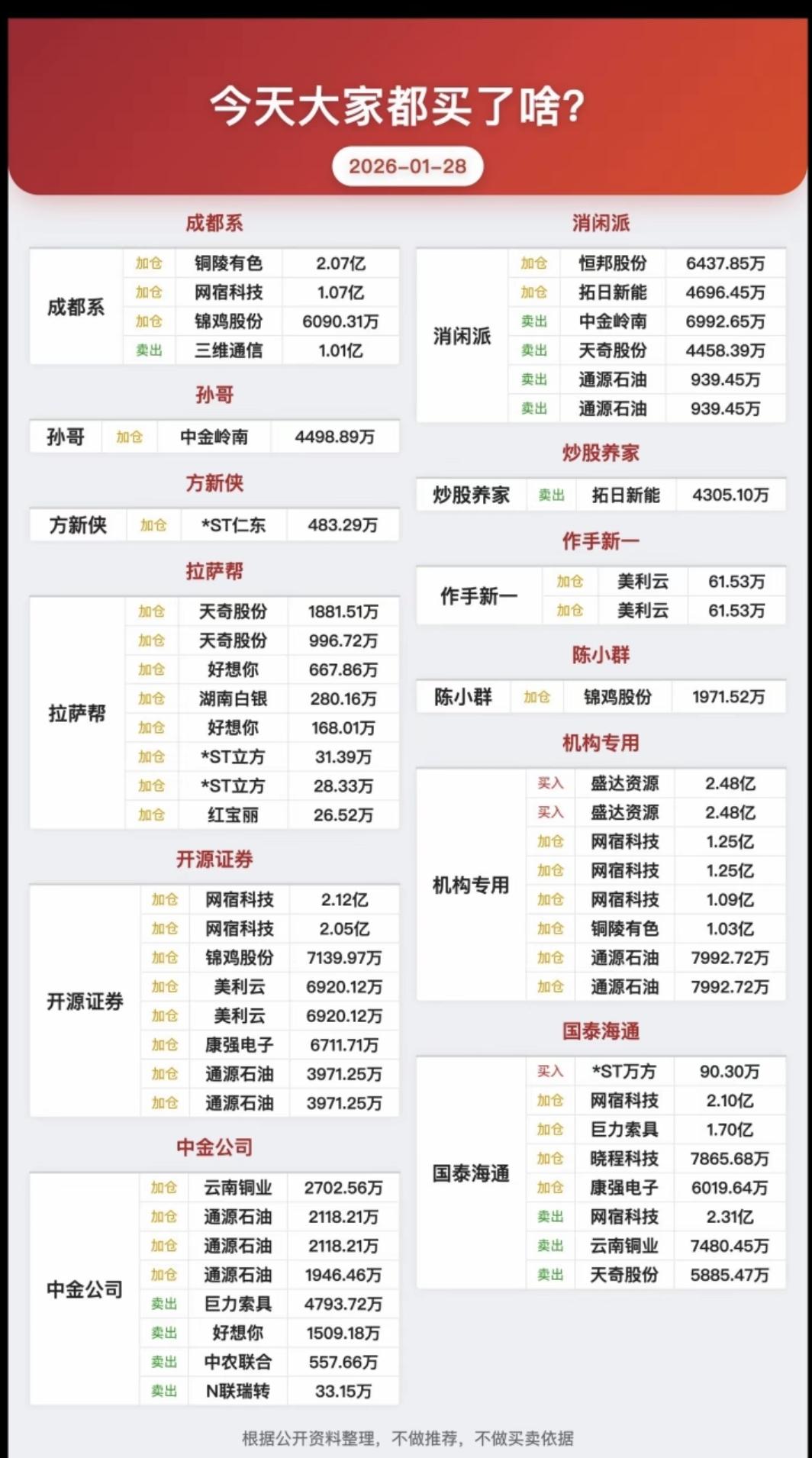 1.28周三 游资抢筹 龙虎榜! 陈小群 入 锦鸡股份 孙哥 入 中金岭南 网宿科技 成都系 入 铜陵有色 锦鸡股份,网宿科技,通源石油获多家游资共同抢筹。