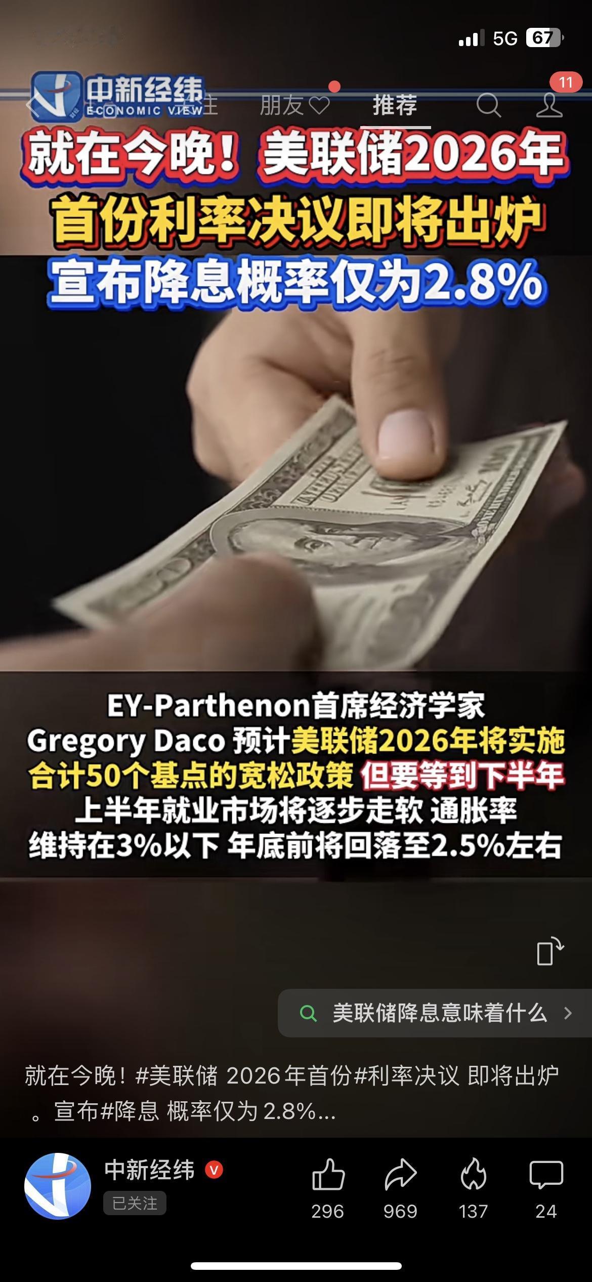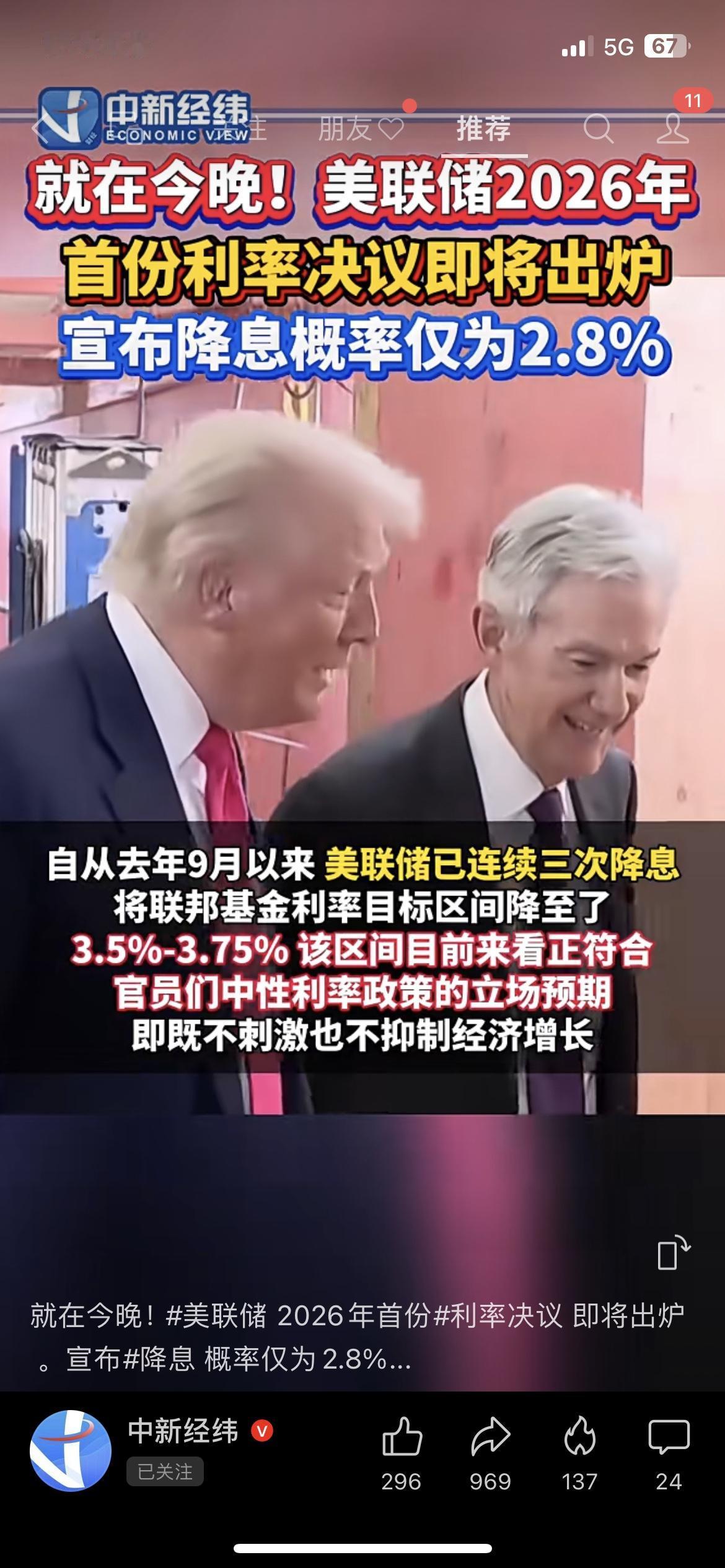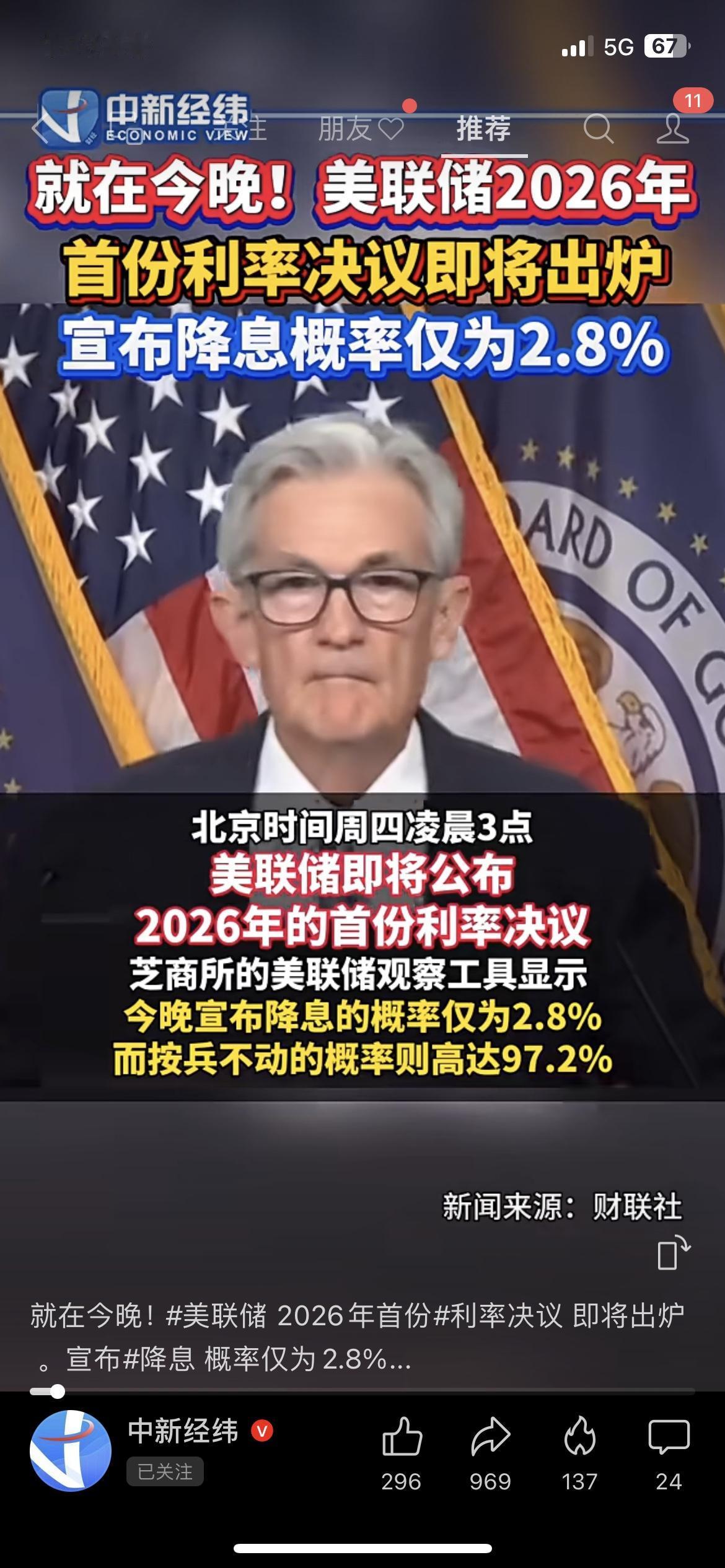 美联储决议今晚出炉,降息概率仅2.8%!黄金别乱追 今晚美联储2026年首份利率决议出炉,降息概率只剩2.8%,专家预测下半年才可能降50个基点。黄金、美股短期波动会更大,咱们别乱操作。 美联储按兵不动,就是给投资者的冷静信号。 市场有风险,投资需谨慎。 你会趁节点加仓黄金,还是持币观望? 美联储 利率决议 黄金理财