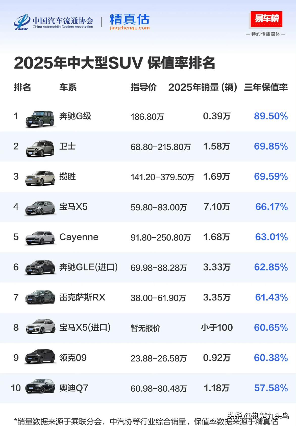 中大型SUV奔驰G三年保值率89.5%,啥也不说了,这台G必须开三年看看[吐舌] 纯电车小米SU7第一,86.05%!