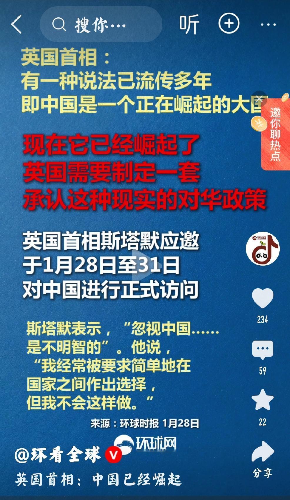 不要被英国人的言语所迷惑 环球网报道,英国首相斯塔默应邀于1月28日至31日对中国进行正式访问,同时表示:“中国是一个正在崛起的大国,英国需要制定一套承认这种现实的对华政策。” 个人认为:中性看待这次英国首相,对中国进行访问。 重要的是:英国承诺之后的行动,而不是看他怎么说。 个人不会忘记,不久之前的法国总统-马克龙在访问中国之际,说的是天花乱坠,可是扭头回国后却是对中国一番诽谤。 所以还是冷静中性,看待英国首相斯塔默的中国之旅。