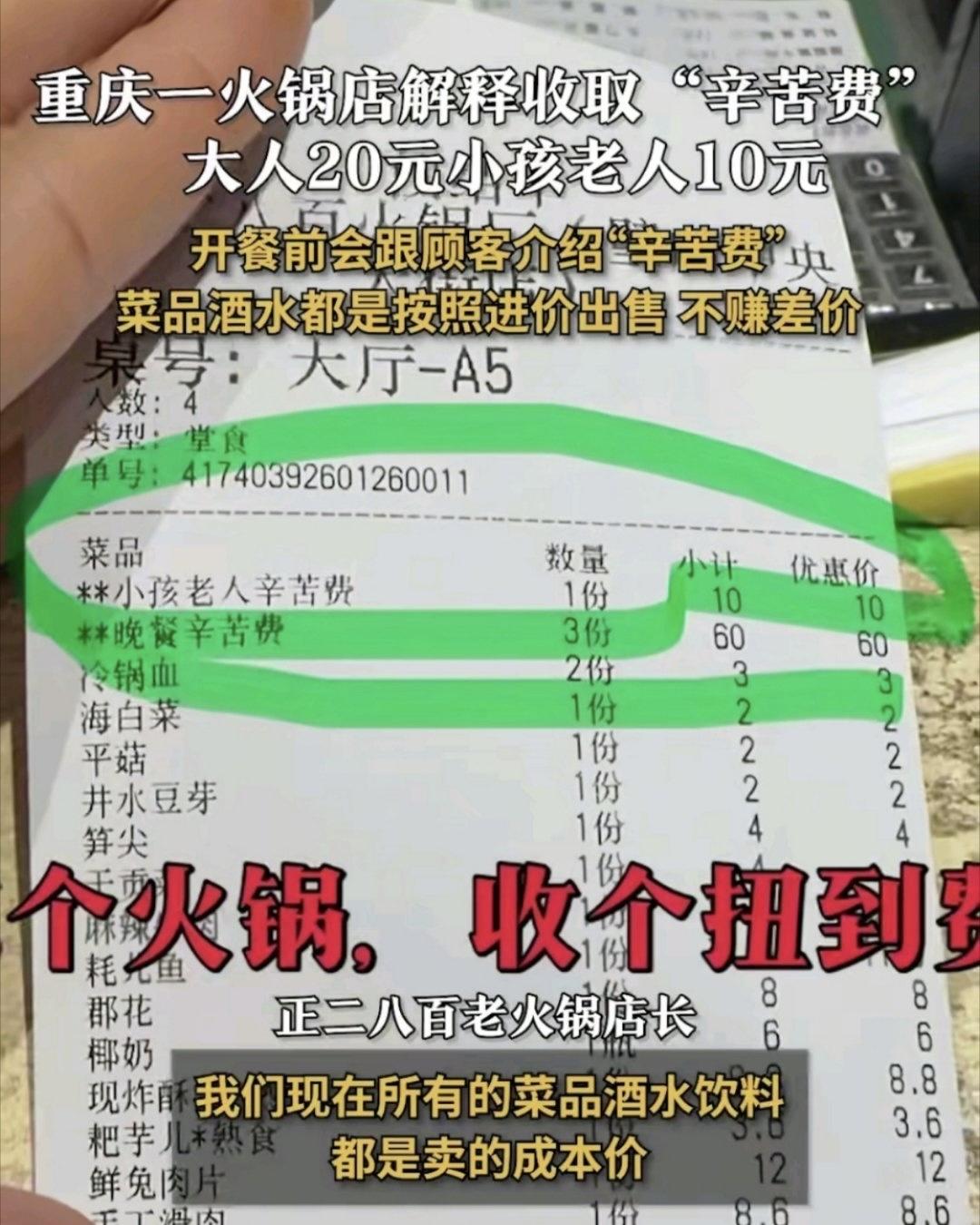 重庆璧山区一家开了8年的老火锅店,最近换了个经营模式:所有菜品酒水都按进价卖,不赚一分差价,荤菜最贵不超过19元,素菜才1块钱,但会按人头收“辛苦费”——午餐大人15元,晚餐20元,老人小孩吃了就收10元,不吃不收费。有顾客去吃饭,看到账单里的“小孩老人辛苦费”“晚餐辛苦费”觉得不解,宁愿菜品涨价也不想付这笔“坐下就消费”的钱。老板回应说收费会提前跟顾客沟通清楚,接受就用餐,这笔辛苦费就是店里唯一的利润,要用来付房租和员工工资,现在大部分顾客能接受,有异议的他们也会免单处理。 其实这事一出来,网上评论就分成了两派。觉得坑的人说,“辛辛苦苦”四个字听起来像是道德绑架,本来去火锅店吃饭,就是为了吃菜品服务,现在额外收一笔“辛苦钱”,感觉像是被强行分担开店成本了。而且就像发帖的顾客说的,宁愿菜价涨几块钱,明明白白消费,也不想看着账单里多出一笔莫名其妙的费用。 但也有好多人替老板说话,说现在餐饮有多卷大家都清楚,前几年火锅店客单价能有八九十,现在根本做不到。打价格战只会让利润越来越薄,不如干脆把成本摊开,明明白白告诉顾客“我不赚菜品钱,只收点辛苦钱”。毕竟服务员端菜、后厨炒料、打扫卫生都要花钱,总不能让老板白忙活。之前不就有网友吐槽过,有些店菜价看着便宜,实则分量偷偷缩水,这家店菜价按进价卖,反而显得更实在。 我倒是觉得,这种模式的本质,其实就是“把服务费明着收了”。以前火锅店的服务费、人工费,都藏在菜价里,大家习以为常。现在老板只是把这部分钱单独列出来,换成了“辛苦费”的说法,反而让人觉得陌生。而且老板提前告知、明码标价,顾客要是接受就消费,不接受可以换别家,也没强买强卖,比起那些悄悄宰客的店,已经算很良心了。 不过老板要是能换个说法,比如叫“服务费”或者“加工费”,可能就不会引来那么多争议了。毕竟“辛苦费”听起来有点卖惨的意思,容易让顾客觉得“我是来吃饭的,凭啥要为你的辛苦买单”。但话说回来,能把生意做成“只赚辛苦钱”,还能坚持8年,已经挺不容易的了。 最后想问大家,如果你去吃火锅,会接受这种“菜品按进价卖,额外收辛苦费”的模式吗?或者你宁愿菜品贵一点,也不想看到账单里有额外的“辛苦费”?来评论区聊聊吧! (事件来源:荔枝新闻)