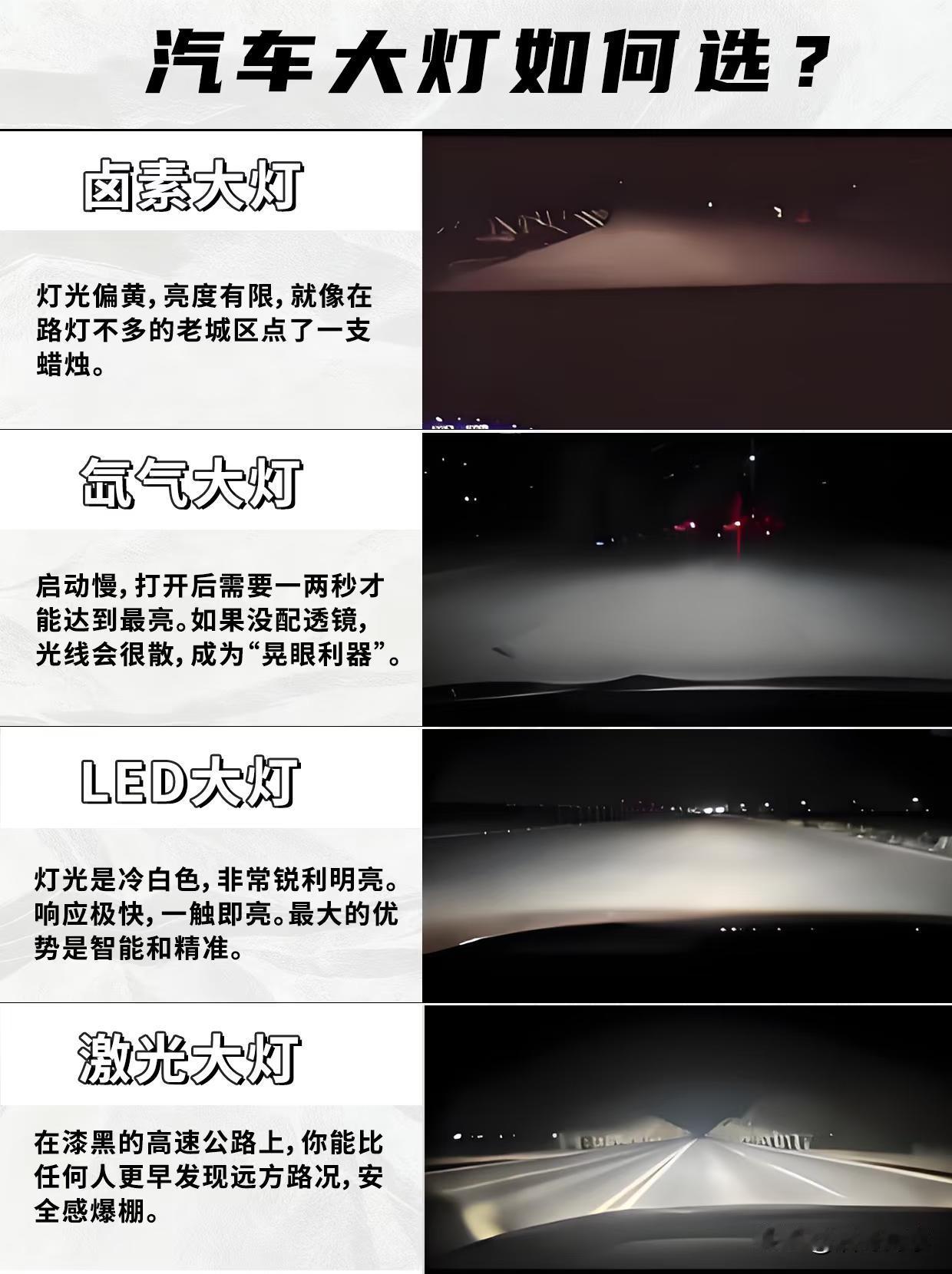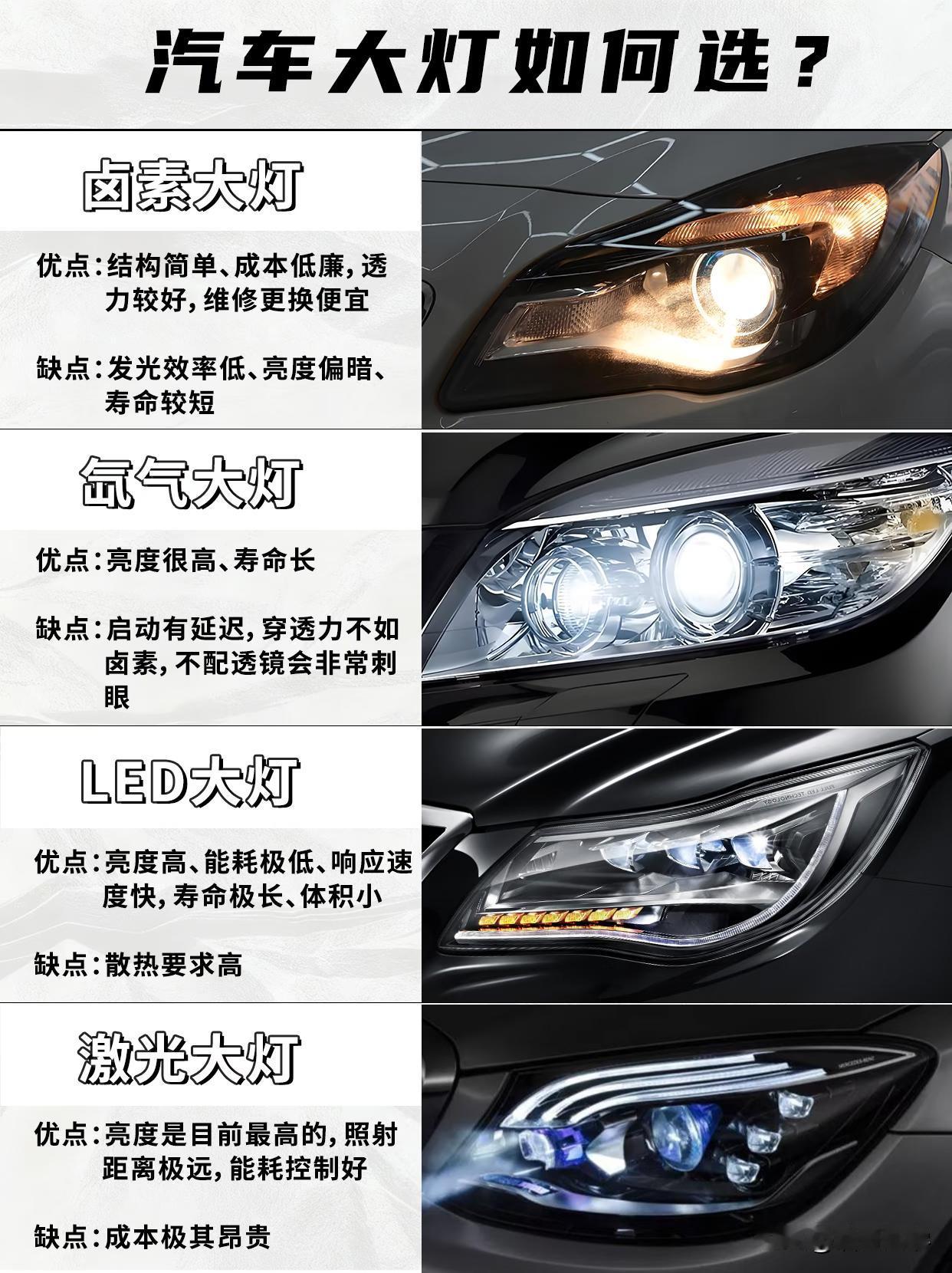 汽车大灯分几种? 目前,在售的汽车大灯一共分为四种,它们分别是卤素大灯、疝气大灯、LED大灯、激光大灯。 卤素大灯就是最普通的那种黄颜色车灯,它的优点是便宜,而最大缺点就是亮度偏暗,使用的寿命不长,通常都会被车主换掉; 疝气大灯就是那种亮度很高,寿命长的大灯,通常都是换车灯的首选,不过它也有一些缺点,就是启动会有延时,就是那种你切换远光灯的时候要等一下才会完全亮起; LED大灯是目前新能源汽车的主流大灯,它因亮度高、能耗低、响应速度快、体积小、寿命极长而深受新能源车企的喜爱,不过就是对散热要求高; 最后一种就是激光大灯,它是亮度最高,射程最远的大灯,不过成本也是最昂贵的,一般的车主很难会选择这种大灯。 那么,你的车是哪种大灯呢? 图片来源:五道口车探 汽车大灯光照 汽车车大灯 车大灯灯泡 汽车前大灯灯 车灯排行 卤素前大灯 车灯品牌排行榜 车灯 车灯寿命 车灯十大品牌 车灯图 汽车大灯感悟 车灯图标 汽车日行灯光源 汽车灯透镜