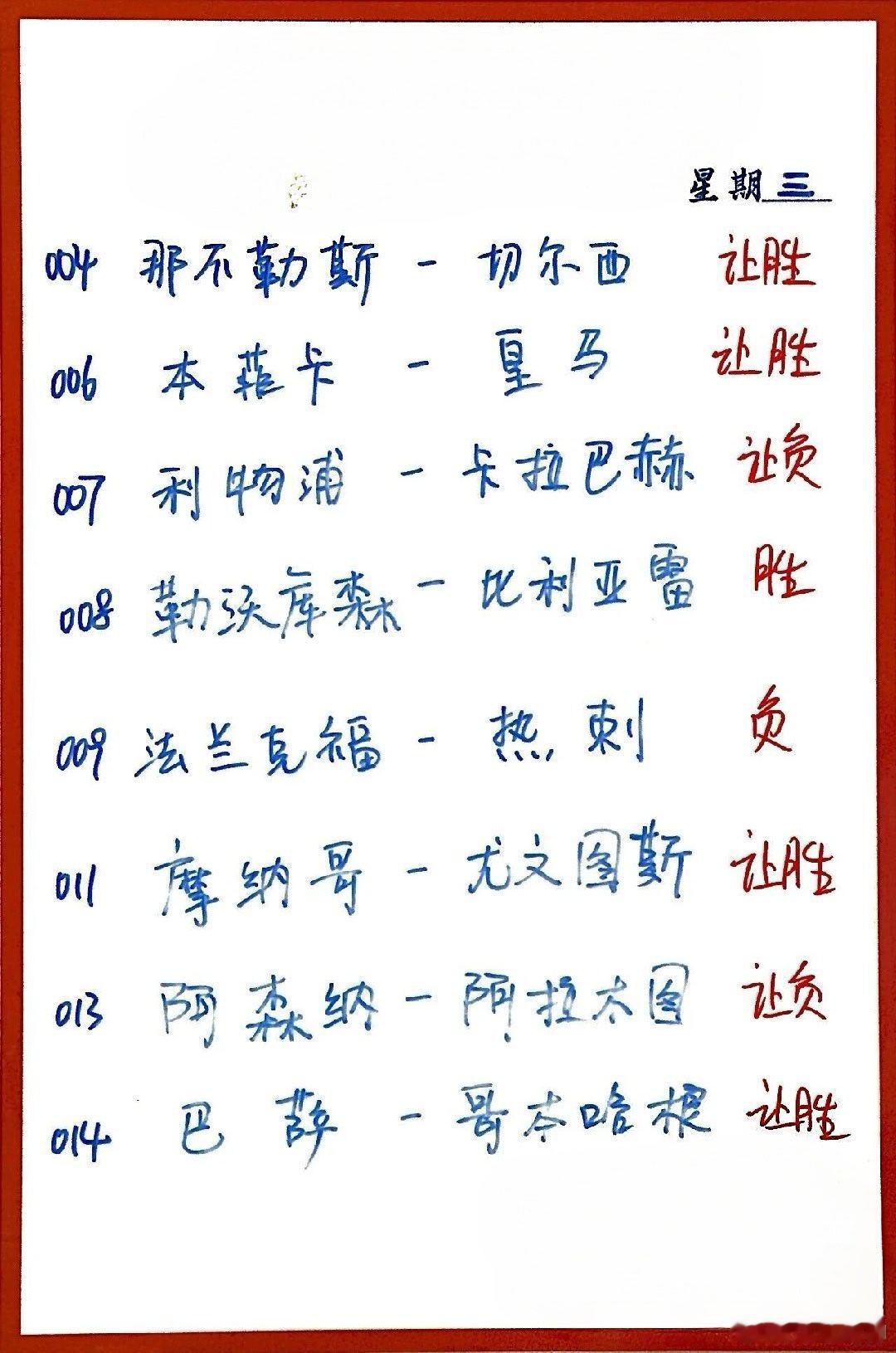 1月28日001 吉达国民 VS 达曼协作002 埃因霍温 VS 拜仁 003 多特蒙德 VS 国际米兰004 那不勒斯 VS 切尔西005 曼城 VS 加拉塔萨雷006 本菲卡 VS 皇马007 利物浦 VS 卡拉巴格