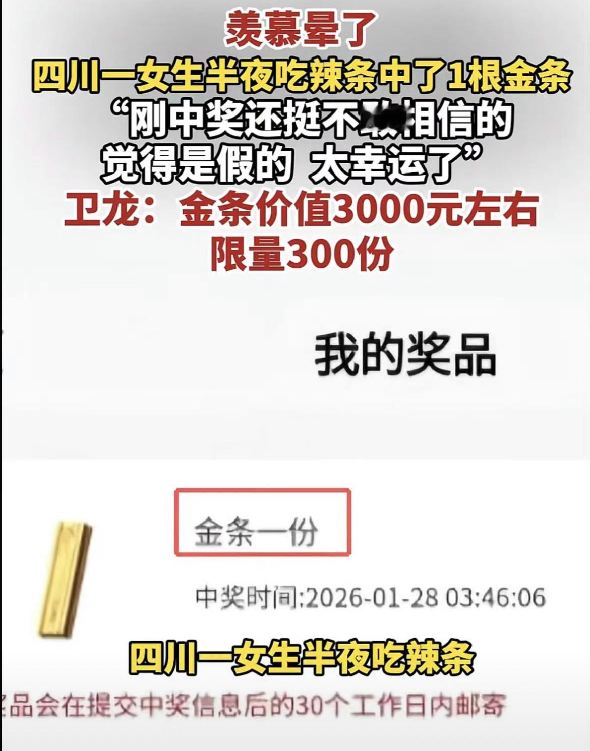 女子吃辣条吃出1根金条爱吃的女孩运气不会差,证明半夜饿了就要吃~卫龙魔芋爽是吧,你等着