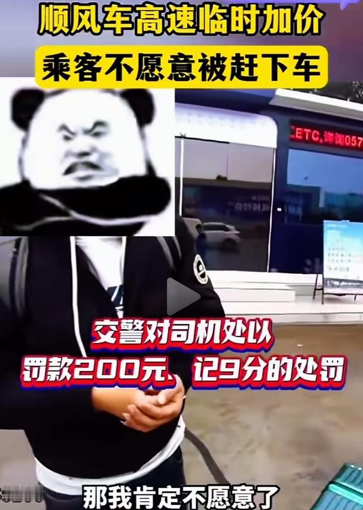顺风车高速上临时加价,乘客拒绝竟被赶下车!司机被罚200元记9分 高速应急车道上,一辆白色轿车突然停下,司机一把拽住乘客的背包:“不加钱就滚下去!” 乘客站在雨里的护栏边,看着车流呼啸而过,气得浑身发抖:“出发前说好的价格,凭啥半路坐地起价?” 司机撂下一句“爱坐不坐”,一脚油门就把人甩在了高速上。 最后,交警赶到现场,对司机处以罚款200元、记9分的处罚。 不少网友评论: ✅“这司机太嚣张了,高速上赶人下车,完全是拿别人的生命开玩笑!” ✅ “平台该管管了,这种临时加价的行为就是欺诈!” ✅ “支持乘客维权,遇到这种事千万别忍!” 出门在外,遇到这种坐地起价的司机,你会怎么办?是乖乖掏钱息事宁人,还是像这位乘客一样硬刚到底? 顺风车 顺风车拒载 顺风车罚款