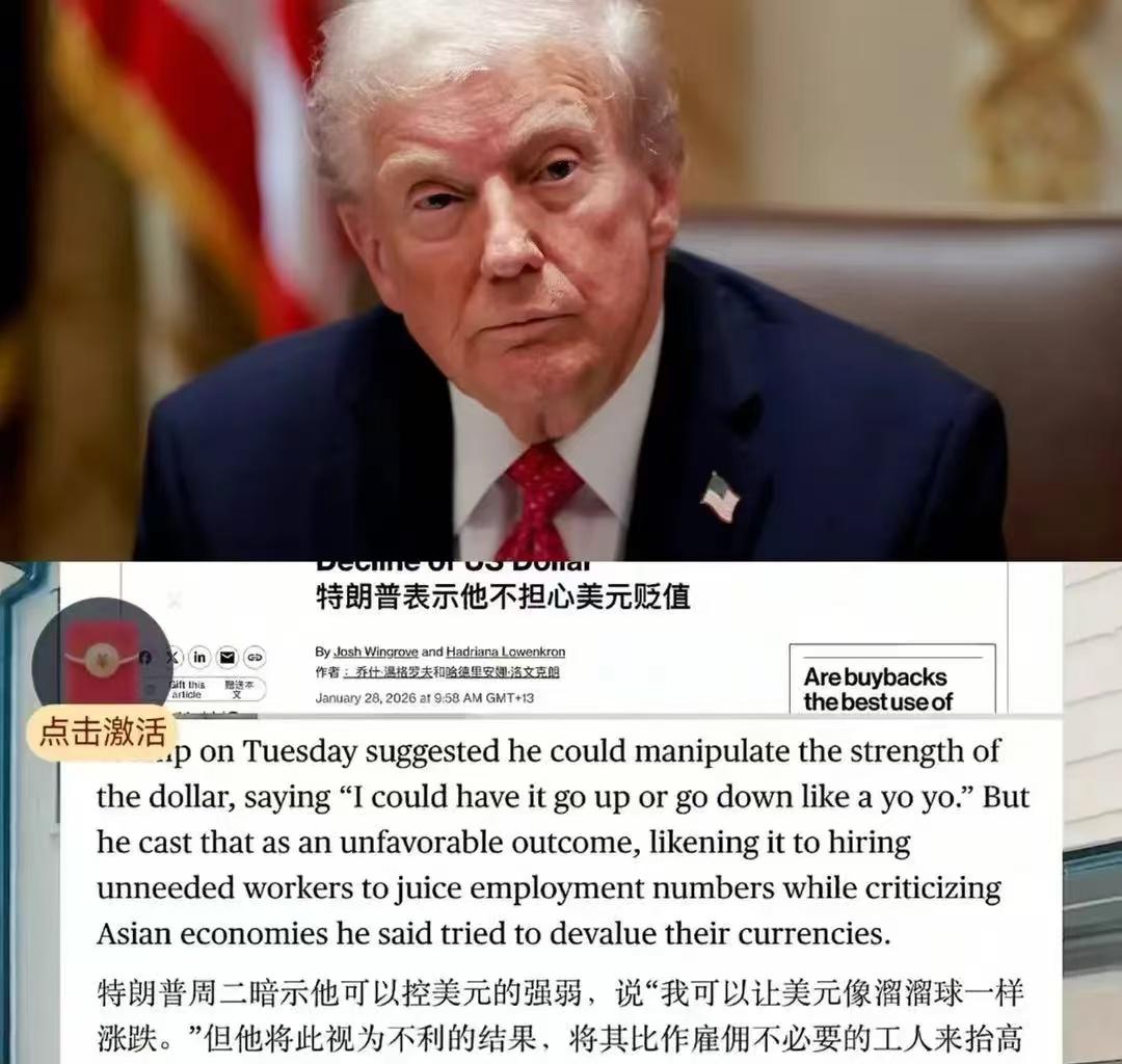 懂王一句话,美元信用彻底抖了 兄弟们疯了,真的疯了! 懂王一句话让华尔街脊背发凉。 他居然说:“我可以让美元像悠悠球一样,想涨就涨,想跌就跌。” 你听听,这是把全球储备货币当自己手里的玩具啊!市场直接被吓蒙,美元信用抖了,黄金一根大阳线直接猛拉90美元。 华尔街的脊背发凉从不是矫情,美元能坐稳全球储备货币的宝座,靠的从来不是美国的霸权,而是实打实的信用根基。 黄金的拉升根本不是短期炒作,伦敦金现直接飙到5283.45美元/盎司,单日涨幅超2%,非美央行持有的美债规模已和黄金储备持平,资本用脚投票的态度再明显不过。 美元的储备地位本就摇摇欲坠,如今占比暴跌至40%创20年新低,2020到2026年各国央行狂减持3.2万亿美元美元资产,这话一出更是直接锤烂市场信心。 特朗普压根没把美联储的独立性当回事,为了逼降息竟用司法手段调查鲍威尔,美联储作为美元信用的核心支柱,正被他按在地上肆意摩擦。 华尔街大佬连夜炸锅,高盛、摩根大通火速发布风险预警,直言这是赤裸裸的金融自杀。美国靠美元铸币税躺着赚全球的钱,信用崩了这门生意直接彻底黄了。 全球央行早就用行动表态,2025年净购金1045吨连续三年破千吨,2026年黄金直接取代美元成全球最大储备资产,这就是对特朗普最狠的回击。 石油美元的神话也早被他亲手戳破,沙特早就开始用人民币融资,石油人民币结算比例持续走高,美元绑定石油的时代,正被特朗普加速推进坟墓。 美股市场直接用暴跌回应,道指单日狂跌超400点,银行股、科技股集体跳水,就连此前疯涨的特朗普概念也崩了,投资者疯狂抛售美元资产。 国际评级机构早看透美国家底,穆迪、范围评级接连下调美国主权信用,美国债务和利息支付比例飙升,烂账一堆还敢玩美元悠悠球,纯属火上浇油。 去美元化的速度直接被拉满,三成央行计划未来十年增持人民币,人民币储备占比有望翻两倍,美元的全球交易核心地位,正被自己人撕得稀碎。 特朗普的算盘全是为了大选选票,想靠美元贬值提振出口、拉拢制造业选民,完全不顾美元霸权的长期根基,眼里只有选票没有美国的全球利益。 金砖国家和新兴市场集体硬刚,巴西、印度疯狂扩大本币结算,美元在国际贸易中的占比持续下滑,没人愿意再被美元的“悠悠球”玩法随意收割。 美联储的反击来得又快又狠,鲍威尔直接硬刚特朗普,直言货币政策绝不能屈从政治压力,美国两党参议员也集体反对,他的操控算盘内部先崩了。 美元能坐稳霸主地位的三大基石全毁了,庞大的贸易逆差难填,制度信任彻底崩塌,独立货币政策被政治绑架,这样的美元谁还敢信谁还敢要。 美国普通民众成了最大冤大头,美元贬值让通胀卷土重来,物价再次飙升,老百姓的钱包被特朗普的政治游戏撕得稀碎,苦日子还在后头。 这波黄金的疯涨从不是单纯的资产炒作,2025年伦敦金涨幅超60%50余次刷新新高,这是全球资本对美元信用的彻底失望,对美国霸权的集体逃离。 把全球储备货币当成私人玩具,终究只会玩砸自己。特朗普的美元悠悠球,看似耍了霸权,实则是亲手敲响了美元霸权的丧钟,最终只会砸向美国自身。 各位读者你们怎么看?欢迎在评论区讨论。