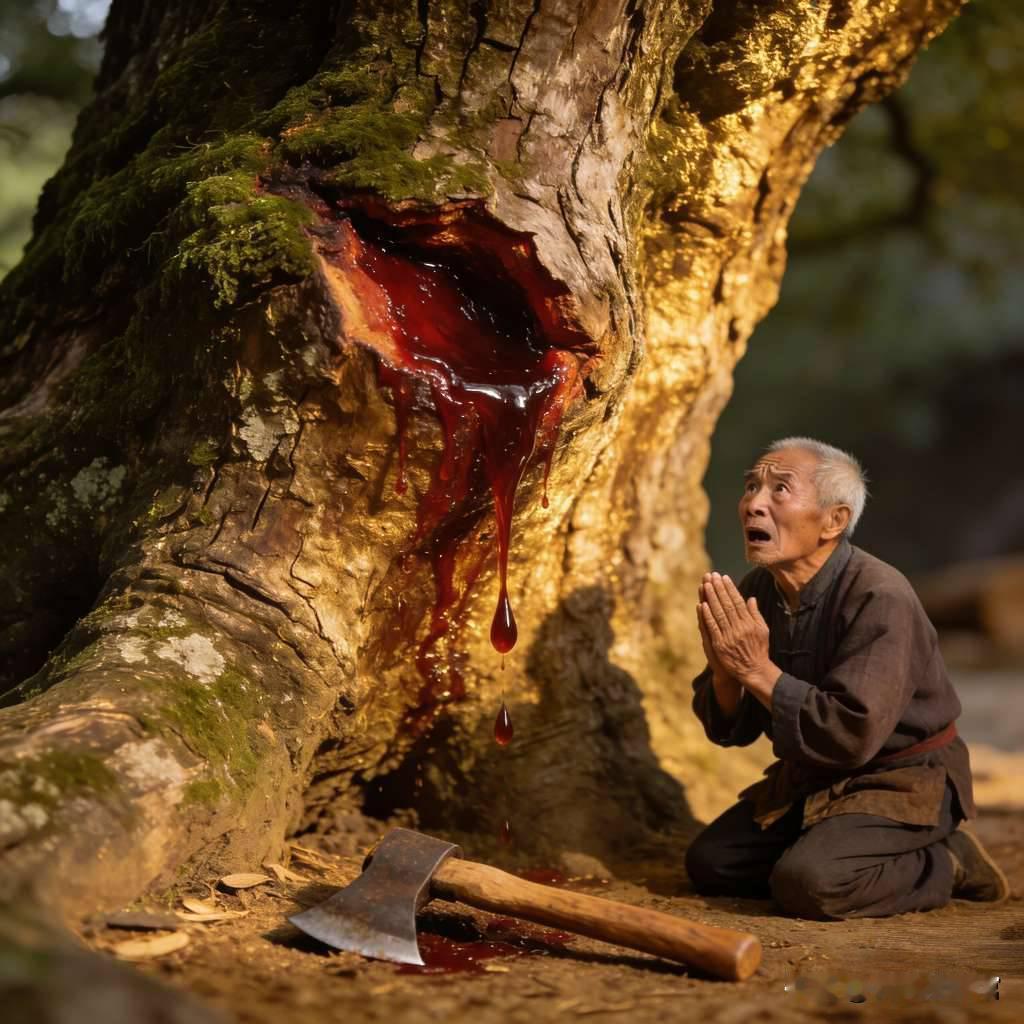 老木匠给千年古树修枯枝,一斧头下去,树干竟流出暗红色液体,还伴着呜咽声,当晚就被托梦! 文案: 这事发生在浙江丽水的古村,村里有棵千年樟树,枝繁叶茂,村民都当神树敬。去年木匠李师傅受村委所托,给古树修掉枯萎的枝桠。他选了个晴天动工,刚举起斧头砍向一根枯枝,斧头落下的瞬间,树干伤口处竟渗出暗红色的液体,像血一样,还隐隐传来呜呜的声音,跟人哭似的。李师傅吓得斧头都掉了,赶紧跪地磕头,说了句“神树莫怪,只为保你长势”。当晚他就做了个梦,梦里一位白发老人站在树旁,对他说“枯枝是我筋骨,怎可随意砍伐”,还叮嘱他要给古树培土浇水。第二天李师傅买了贡品祭拜,又给古树培了新土,此后再也不敢动古树的一枝一叶。村里老人说,那古树是树神附身,流血是树神显灵,多亏李师傅及时赔罪,不然要惹大祸。 后来那棵古树新枝长得更旺,还结出了从没见过的红果子,你猜树神真的存在吗?为啥古树会“流血”古树传说 民间故事 树神显灵 真实乡村故事