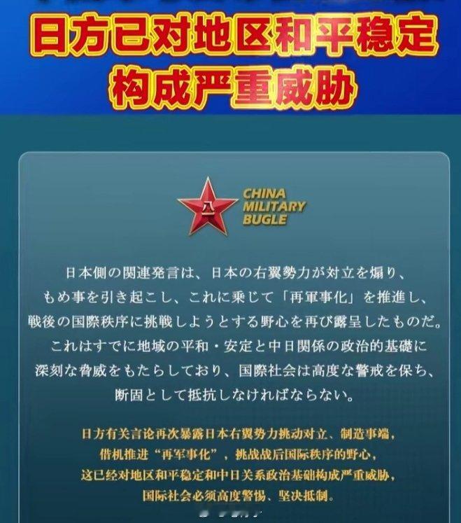 中国军号发日语海报提醒警惕日方很多人第一反应是否意味着要提前武统了?别慌,这并不意味着马上要“动手”或爆发战争。看到这样的强硬表态,心里反应是人之常情。毕竟,之前的说法:通常是“坚决反对”、“严正交涉”。现在的说法:直接定性为“日方已对地区和平稳定构成严重威胁”,甚至用了“迎头痛击”、“再清算历史罪行”这样的词汇 。但结合目前的局势来看,这更像是一次“外科手术式”的战略威慑和舆论战,目的是为了“止战”而非“开战”。 专栏 · 中美博弈|俄美博弈|中俄联手|寰球动态