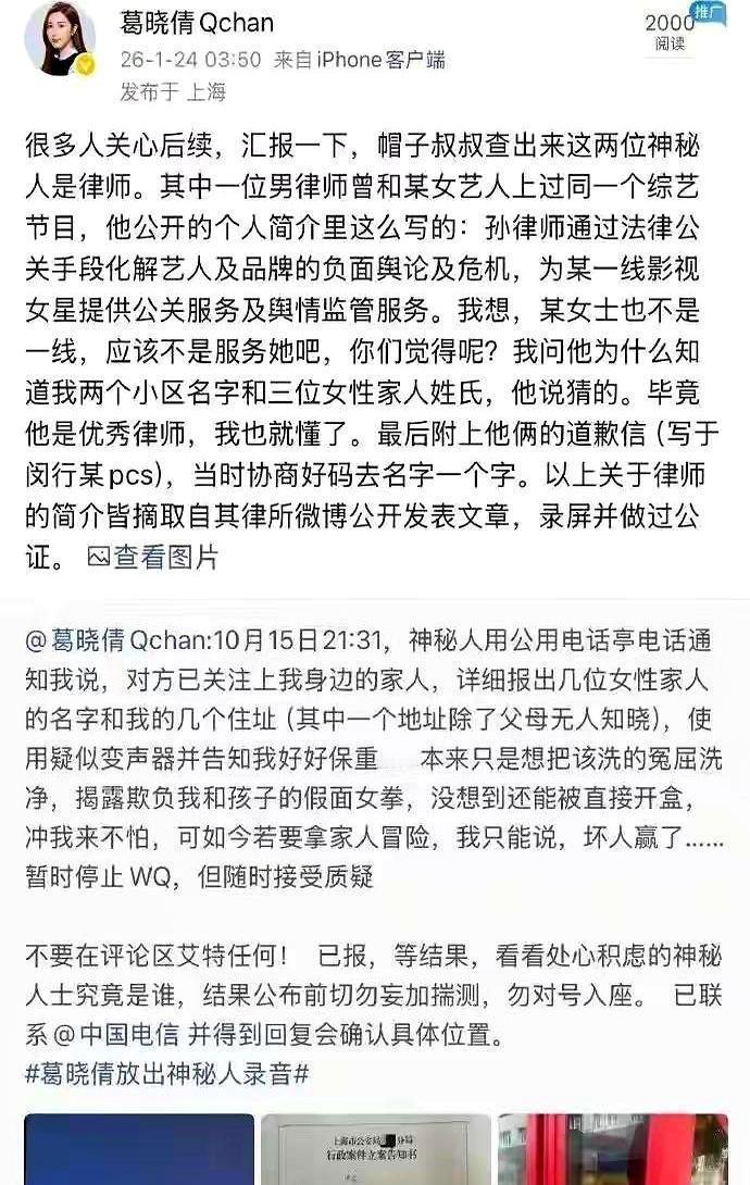 一个变声器打来的威胁电话,精准报出葛晓倩的私密住址,警告她“保重”。 谁在幕后操控? 警方调查结果,直接把矛头指向了两名律师,其中一人,专为一线女星做“舆情监管”。 这通电话的起因,是葛晓倩甩出的一份公证过的代孕合同。 合同显示,张雨绮的双胞胎,出生日期竟相差近3个月。 一个7月生,一个10月生。 你见过这样的“双胞胎”吗? 律师的道歉信写得轻描淡写,说是“关心过度”。 但这位律师,不仅跟张雨绮上过同一档综艺,履历里更是白纸黑字写着他的“专长”。 另一边,辽宁春晚的节目单,已经悄悄删掉了张雨绮的名字。 女性之间的冲突,往往只是舞台上的序幕。 真正的较量,不在于谁的嗓门更大,而在于谁的底牌更硬。