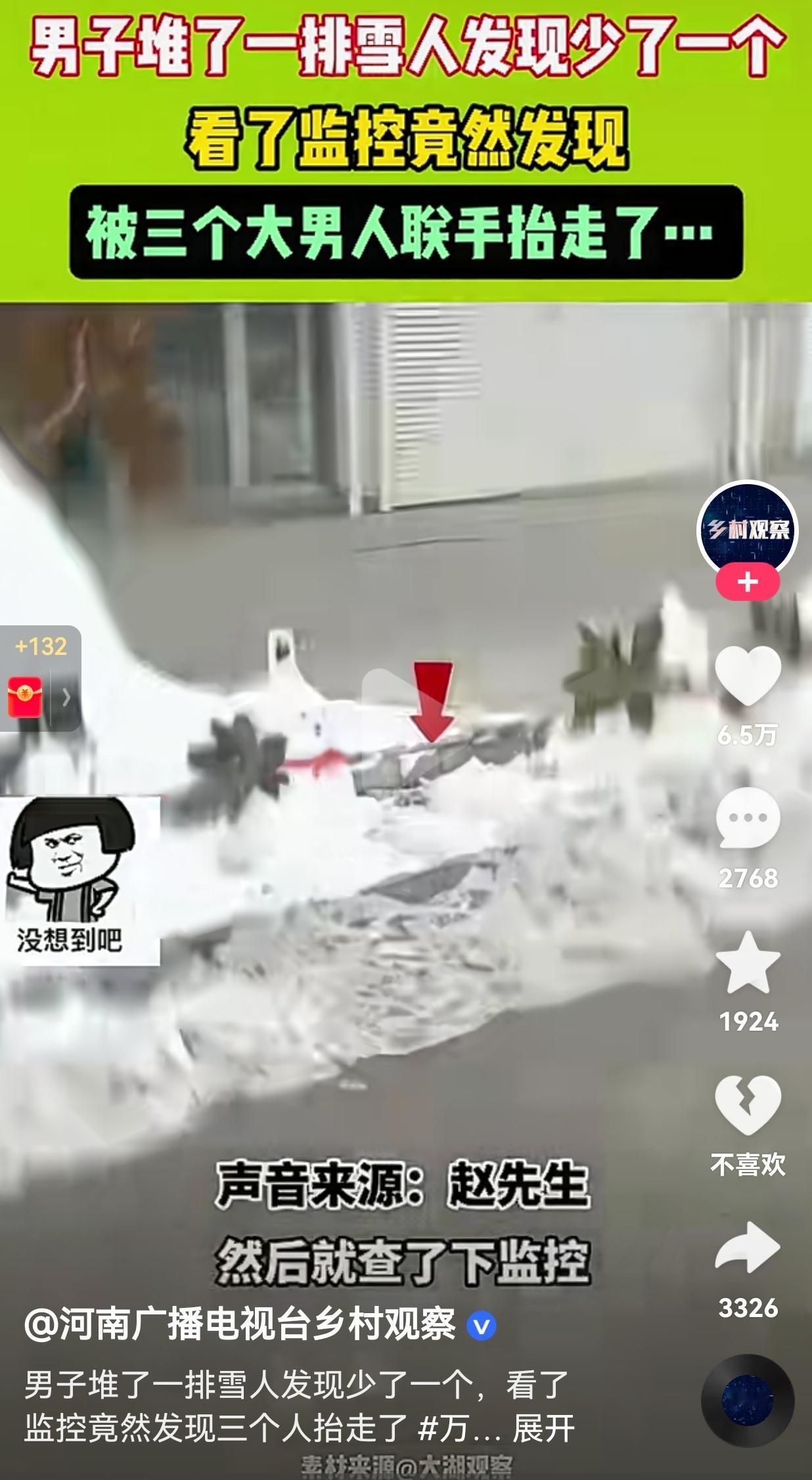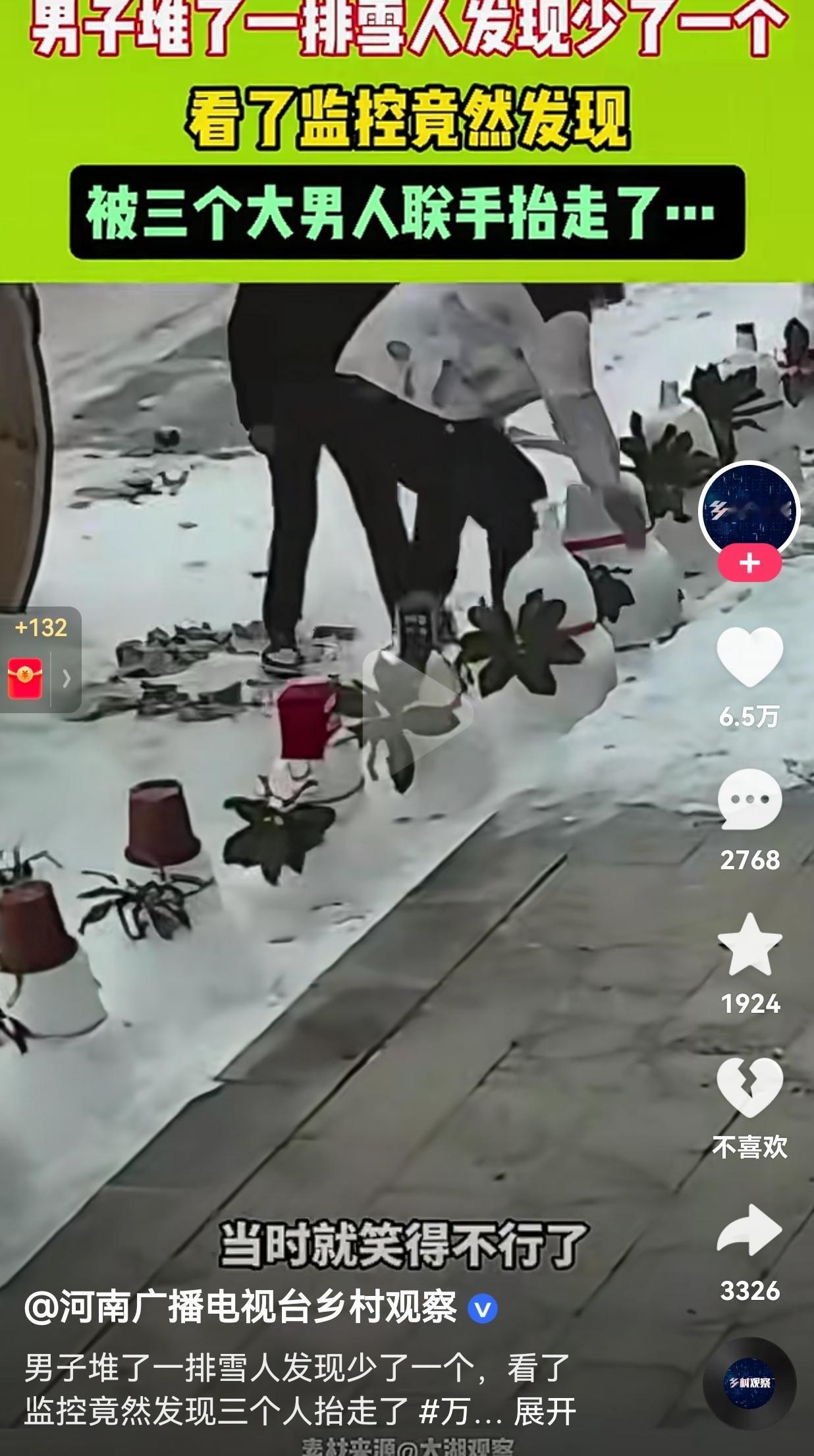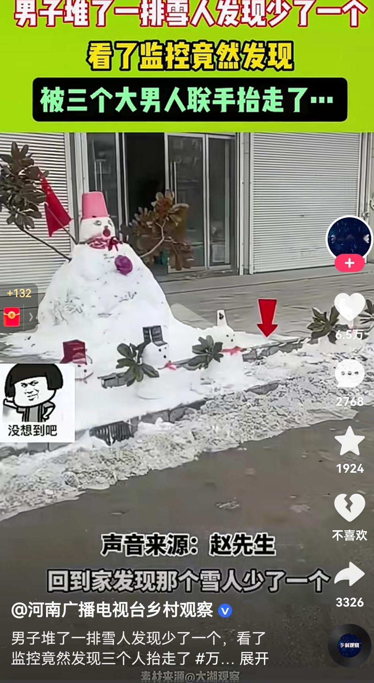 笑不活了!三个大男人的做法能把人笑死!河南的赵先生堆了一排可爱的雪人,摆在家门口,想着给冬日街头添点年味。 结果,这天他下班后,回家一看,好家伙,雪人竟然丢了一个,虽然雪人不需要花钱,他忍不住想一探究竟, 结果通过监控一看,差点笑出眼泪。监控中,三个大老爷们,为了一个雪人,愣是合力把一个雪人抬上了三轮车上,更搞笑的是他们三个人,临走还不忘拿手机拍个视频留念。 一开始我还挺替赵先生生气的,这不是瞎捣乱吗?可看到赵先生自己对着监控笑得直不起腰,说“第一次遇到这种事,感觉挺有意思的”,我突然就懂了。 这哪里是偷雪人,分明是三个没长大的孩子,把别人的浪漫当成了自己的快乐。 他们没踩坏雪人,没搞破坏,只是像小时候偷摘邻居家的枣子一样,单纯觉得“这玩意儿真好玩,我也想要一个”。 网友看到后评论说:“成年人的快乐真的好简单,一个雪人就能让一群人开心,这波不亏。” 还有的网友说:“仨大老爷们偷雪人还拍视频,是怕别人不知道他们偷了个小可爱吗?😂” 雪人被偷了,赵先生相对这种情况,并没有追究,没有报警,只是笑着把监控分享了出来。 这种豁达和包容,比雪人本身更暖。他让我们看到,面对生活里的小插曲,比起较真和愤怒,笑着接住这份可爱,反而能收获更多温柔。 这个冬天,我们见过太多严肃的新闻、紧绷的情绪,可这个偷雪人的故事,却像一缕阳光,照进了每个人心里最柔软的地方。它让我们想起,原来成年人的快乐,也可以这么简单。 对此,你有什么看法呢?欢迎大家评论区讨论留言。
