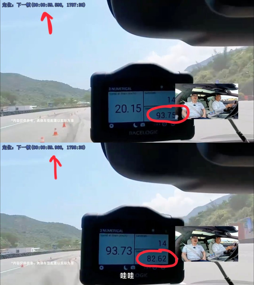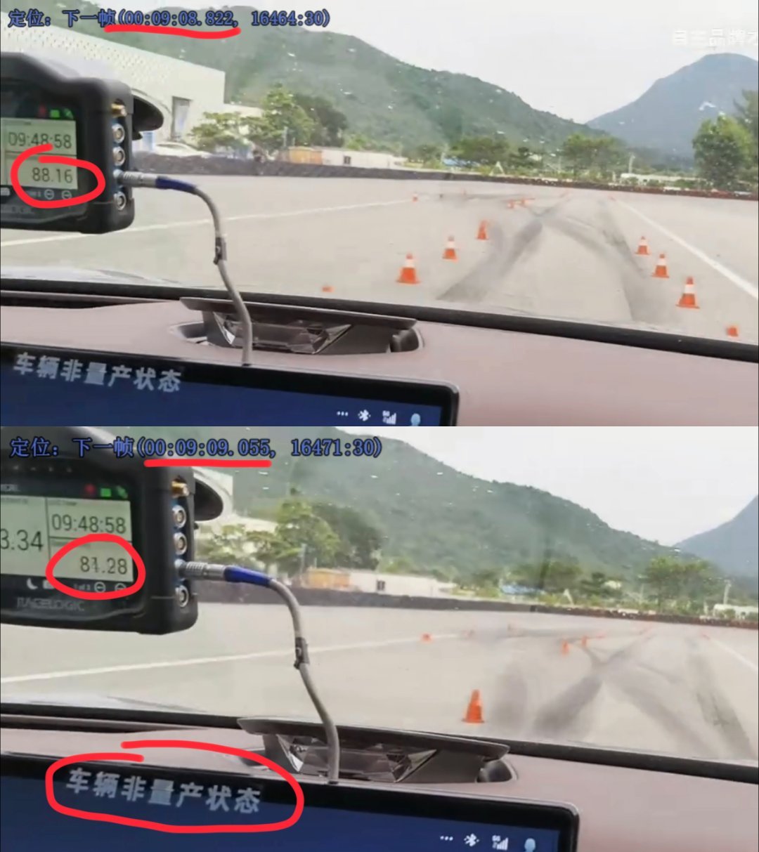 腾势Z9GT麋鹿测试的真相,就藏在车速数据里!经网友提醒,发现在 赵长江V 和 自主品牌才是国家希望 的两段麋鹿体验视频中,车载GPS都显示了实时车速!那这下就好办了,我们能直接算出“收油减速度”了先看赵长江视频:车速从 93.75 km/h → 82.62 km/h,耗时 0.368s,速度下降 11.13 km/h ,减速度 ≈ 0.86G!注意:民用车轮胎抓地极限通常也就 1.0G 左右,而麋鹿测试全程是不踩刹车。这松个油门就接近紧急制动了?! 难怪现场入桩区留下胎印。再看自主老哥的视频:若只取0.1秒,88.16 → 84.90 km/h,减速度高达 0.92G ,但这误差可能有点大。再拉长一次采样到0.233秒,88.16 → 81.28 km/h,减速度 ≈ 0.84G。从两段视频来看,保守估计腾势Z9GT在麋鹿A区收油时,减速度峰值也在0.8G以上!这什么概念呢?此前被骂惨了的特斯拉单踏板模式,最大减速度仅约 0.3G,而且还有个过渡。而这台“非量产车状态”的腾势Z9GT就厉害了,不踩刹车、只松油门,眨眼功夫就能达到 0.8G 级别的减速效果,几乎等同于一脚重刹!试问哪辆量产版的腾势Z9GT,能做“松油即重刹”?现在再看车上贴的那句“车辆非量产状态”,就明白其深意了吧