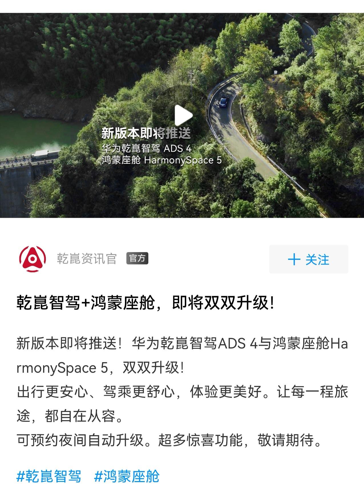 好饭不怕晚,该来了总是会来,华为乾崑智驾ADS4.1即将推送。 同时升级的还有鸿蒙座舱5.0,也算是智驾延期之后的一个惊喜吧。 等新版本推送了,准备好好深度体验一下,看看效果如何。