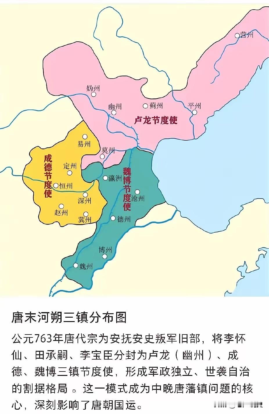 唐德宗贞元二年(786年)河朔三镇形势图,安史之乱虽然被平定了,但招降的安史降将又相继成了新的军阀藩镇,他们割据河北,不服从唐朝中央政府管辖,形成了世袭、自擅财赋、军事独立的“河朔故事”。魏博、成德及卢龙(763-923年)三大藩镇节度使,其在唐朝中后期持续存在了160年,直到后唐时期才基本解决割据。 唐朝 历史冷知识