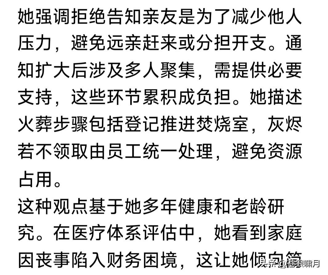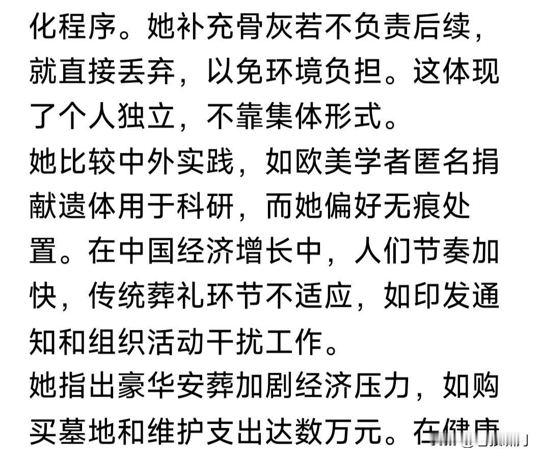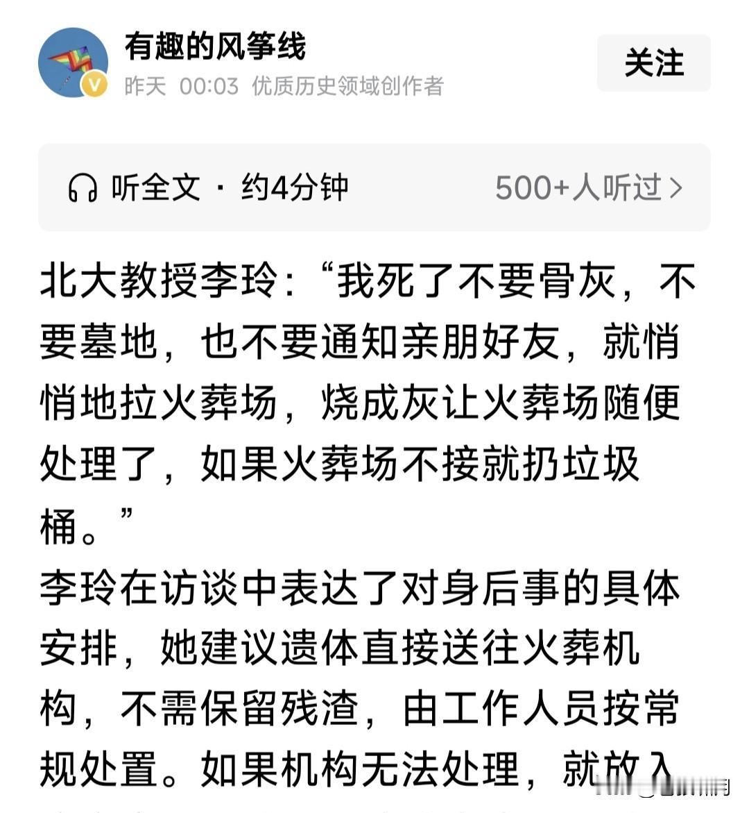 北大教授李玲:我死后不要骨灰,不要墓地,也不要通知亲朋好友!就悄悄地送火葬场,烧成灰让火葬场处理了。如果他们不处理,就扔垃圾桶得了! 到底是大学教授,读书多见识广,看得开悟的透!看破人间红尘,悟透世间万事,对生死看得如此洒脱,让人敬佩!只是仔细品味,有点感伤上心头! …………