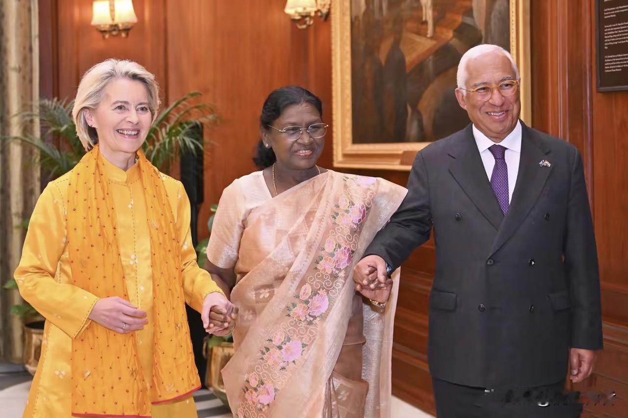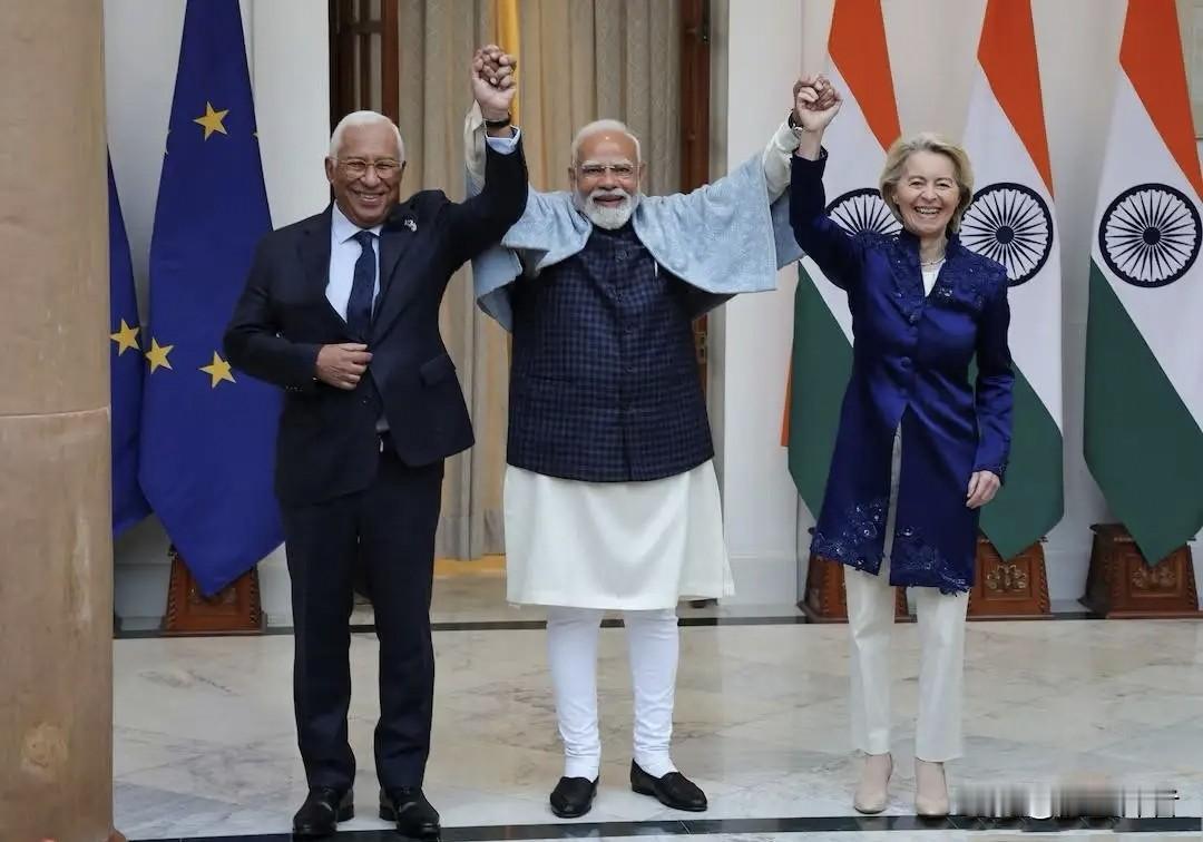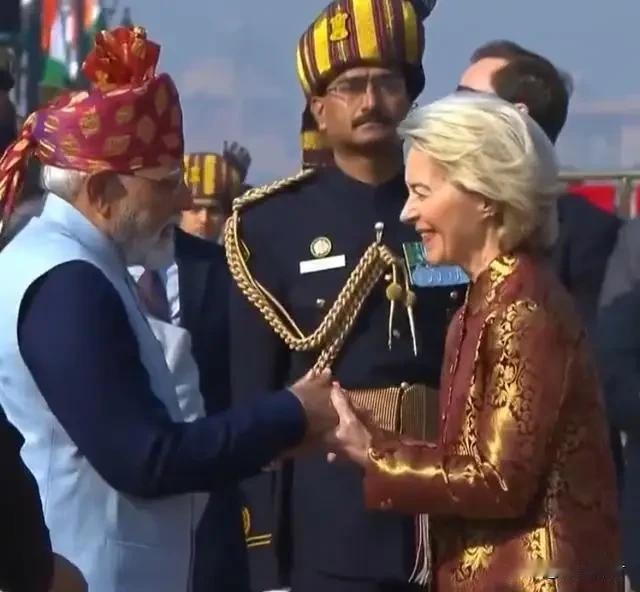 为了拉拢莫迪,平时傲慢的冯德莱恩也是拼了,在四个不同场合穿着4套不同的印度传统服饰出席与莫迪的会晤。 不过这招真管用,莫迪老爷子看起来很开心,大笔一挥,印度和欧盟拍拖了20年之久的自由贸易协定签署了。
