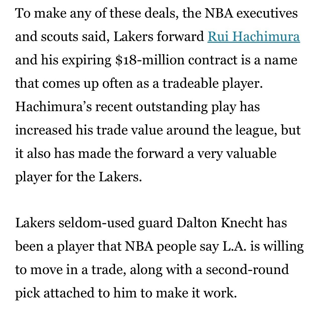 Brad Turner:多位NBA高管和球探表示,在任何潜在交易中,湖人前锋八村垒以及他那份即将到期的1800万美元合同,都是被频繁提及的可交易人选。八村近期的出色表现,不仅提升了他的交易价值,也让他成为湖人阵中极具价值的一员。另外,相关人士透露,湖人不太常用的后卫克内克特也是球队愿意送走的球员,但需要搭上2032年次轮签才能促成交易。