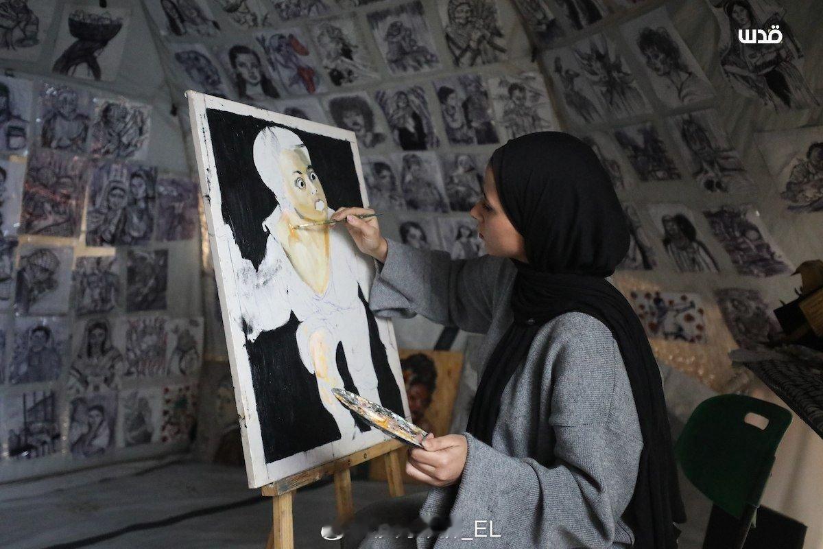 巴勒斯坦加沙地区的女画家玛拉·哈立德·阿尔扎宁在难民帐篷内坚持创作。